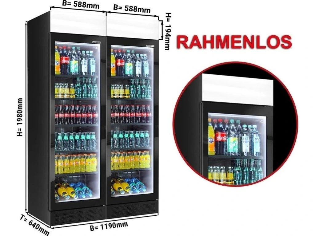 (2 sztuki) Chłodziarka na napoje - 690 litrów - bezramkowa konstrukcja - 2 szklane drzwi & wyświetlacz reklamowy