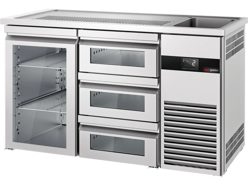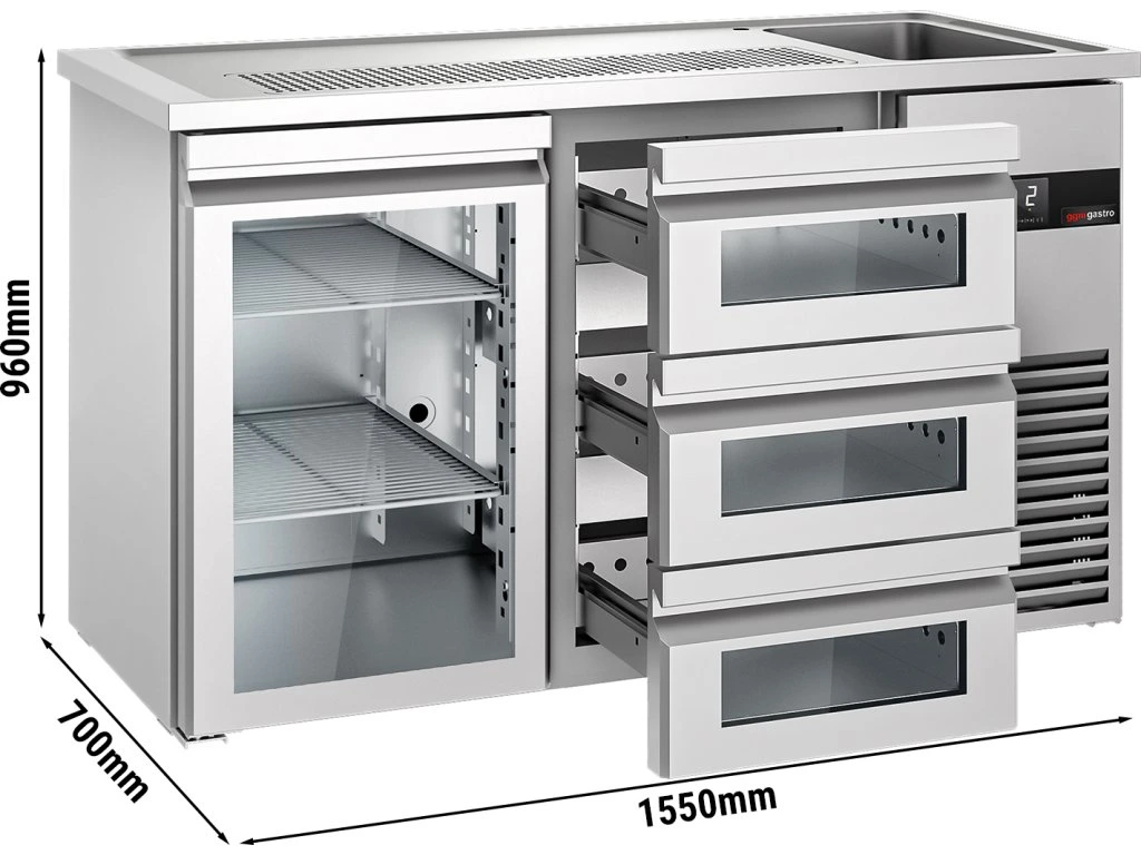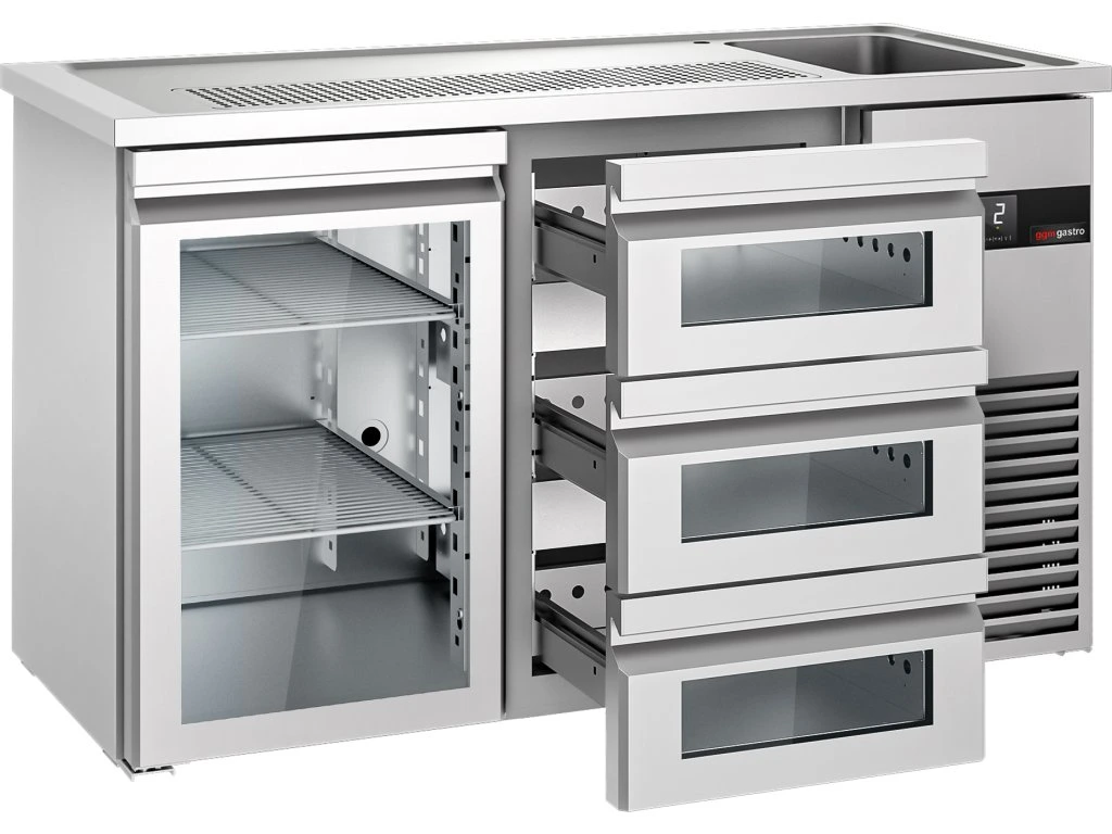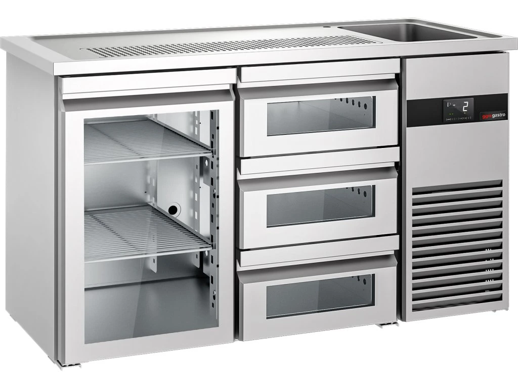Barowy stół chłodniczy PREMIUM - 1550x700 mm - 1 szklane drzwi & 3 szklane szuflady