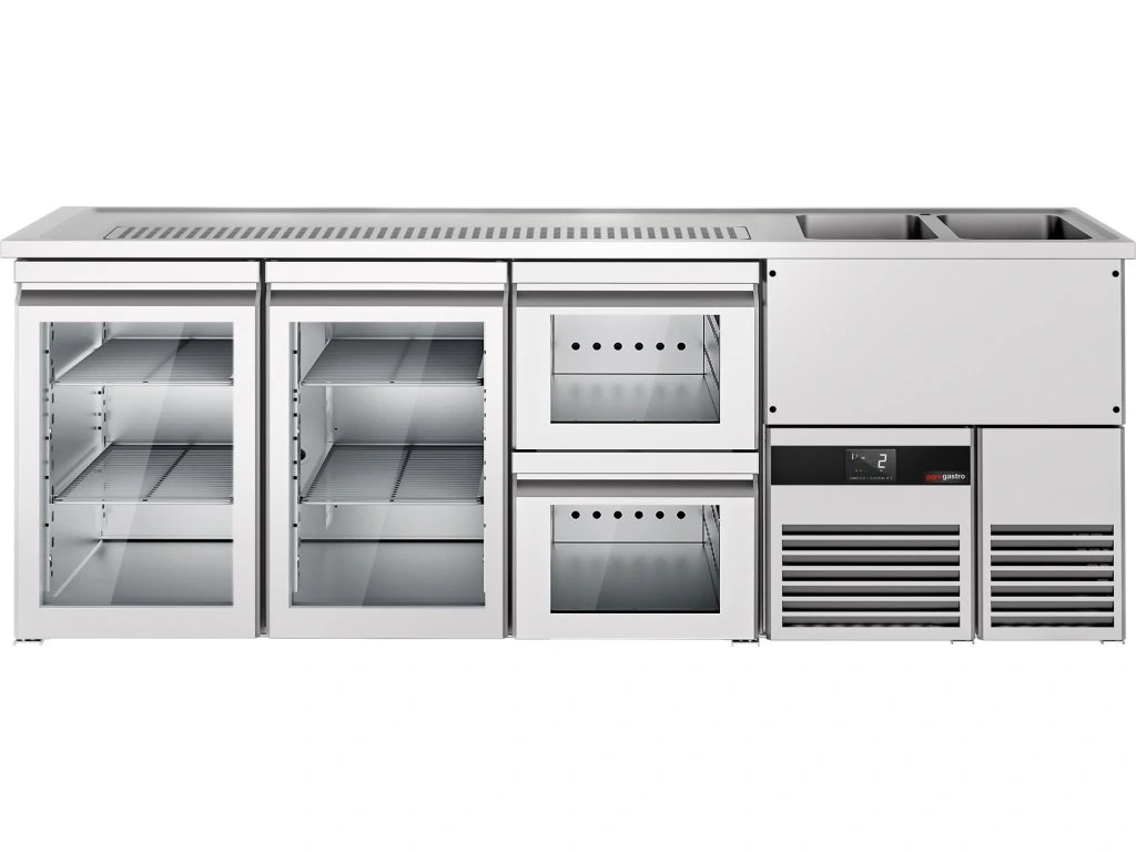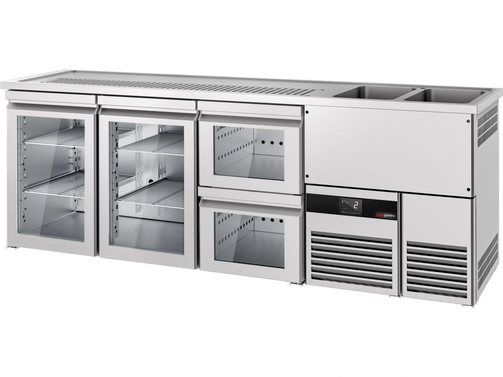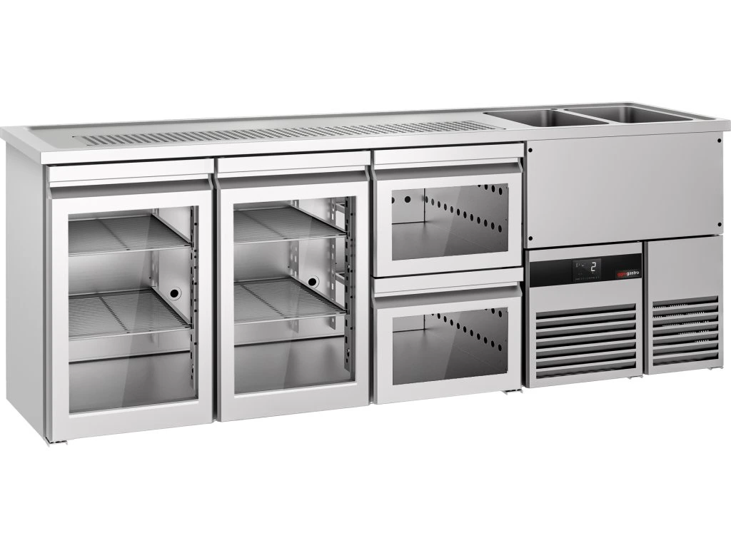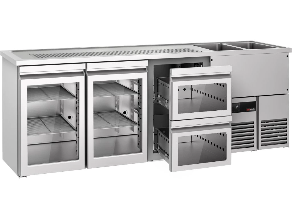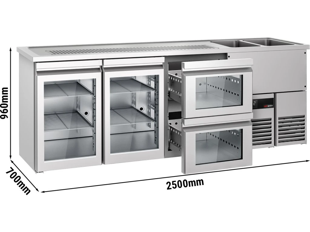 Barowy stół chłodniczy PREMIUM - 2500x700 mm - 2 szklane drzwi & 2 szklane szuflady