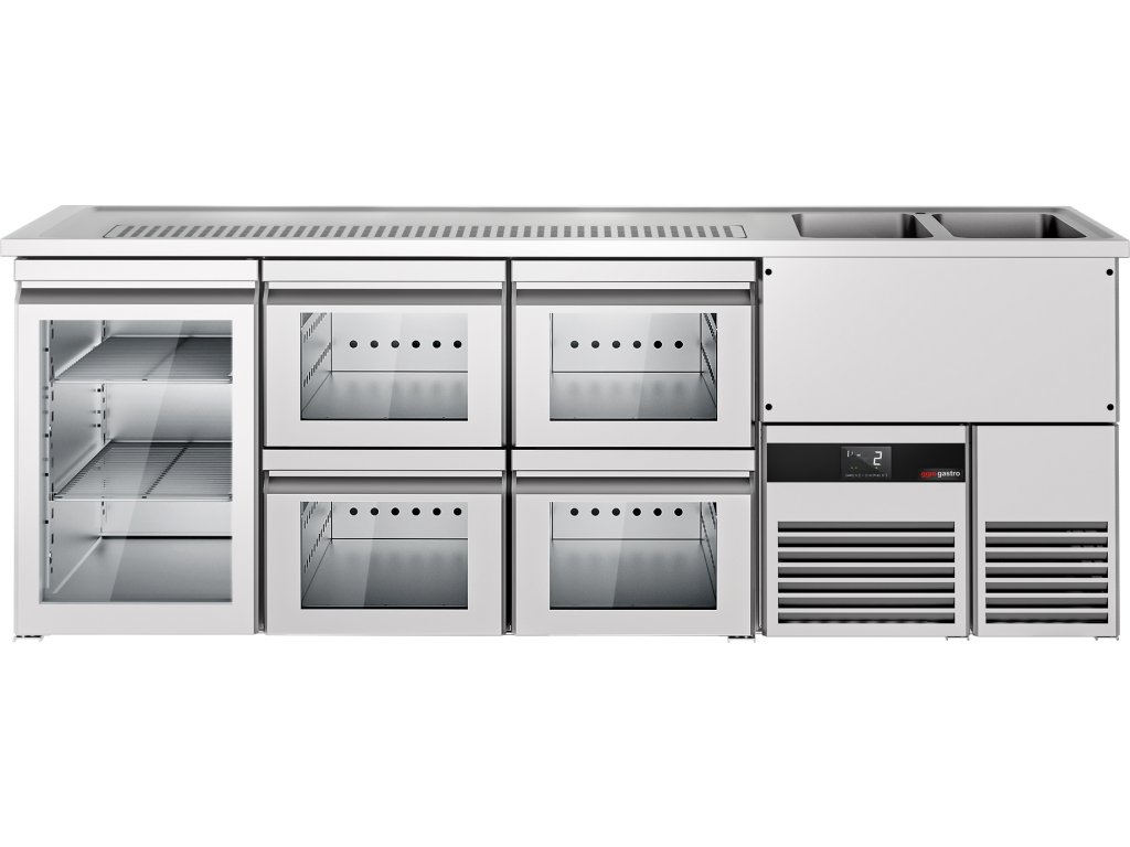 Barowy stół chłodniczy PREMIUM - 2500x700mm - 1 szklane drzwi & 4 szklane szuflady