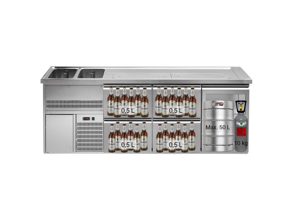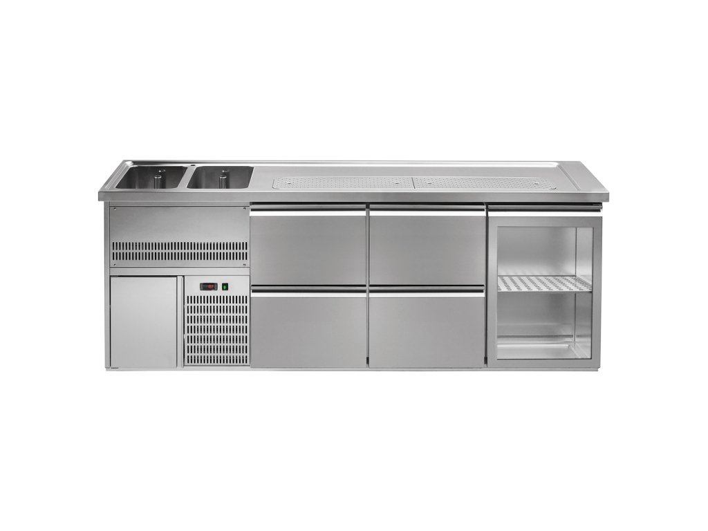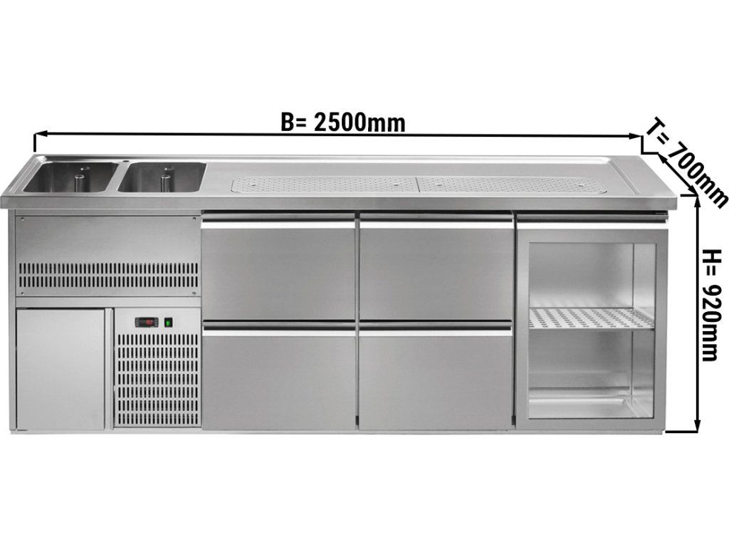 Barowy stół chłodniczy PREMIUM PLUS - 2500x700mm - 1 szklane drzwi & 4 szuflady