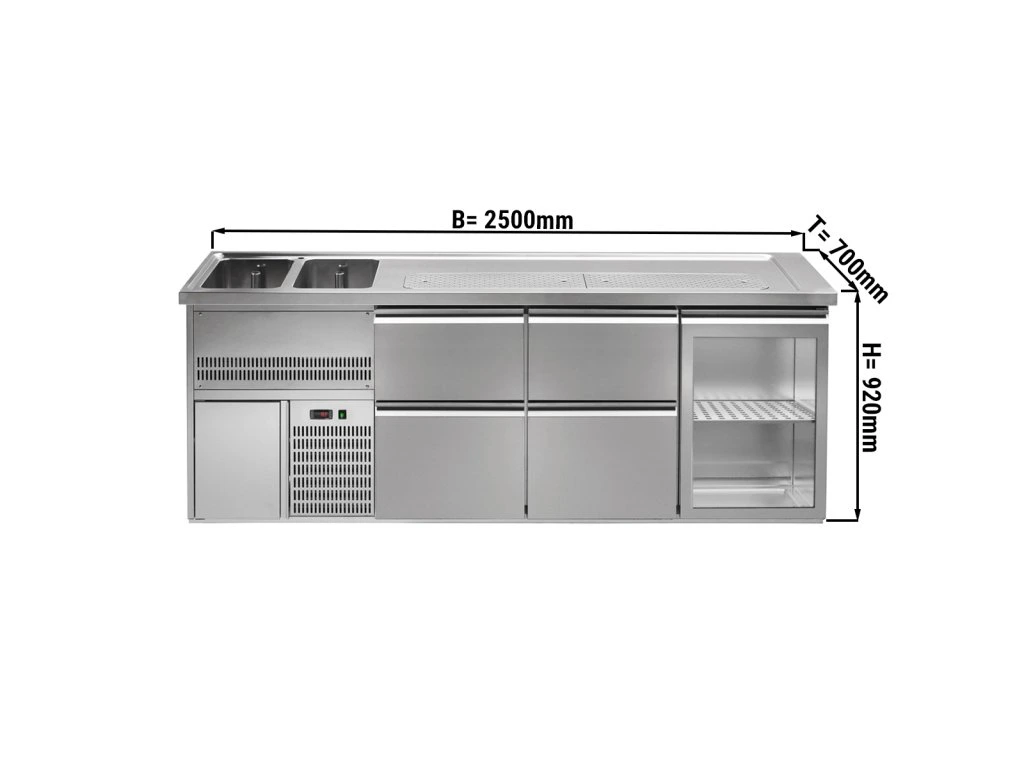 Barowy stół chłodniczy PREMIUM PLUS - 2500x700mm - 1 szklane drzwi & 4 szuflady