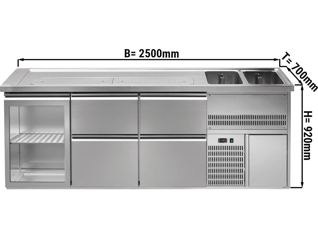 Barowy stół chłodniczy PREMIUM PLUS - 2500x700mm - 1 szklane drzwi & 4 szuflady