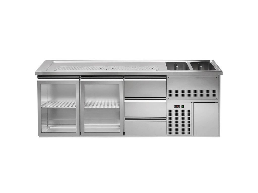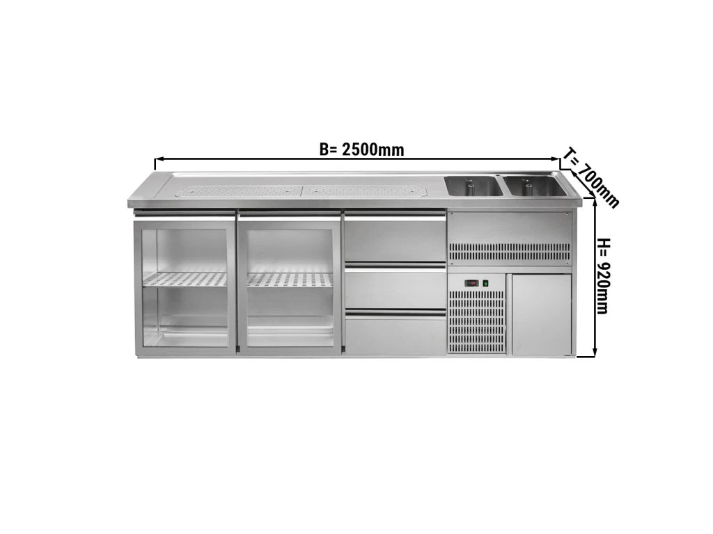 Barowy stół chłodniczy PREMIUM PLUS - 2500x700mm - 2 szklane drzwi & 3 szuflady