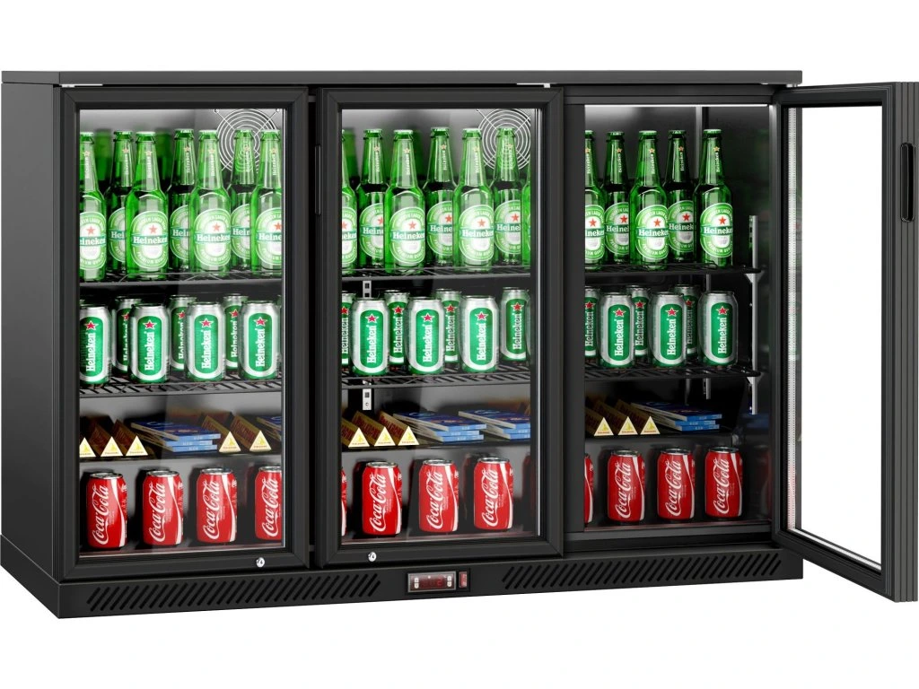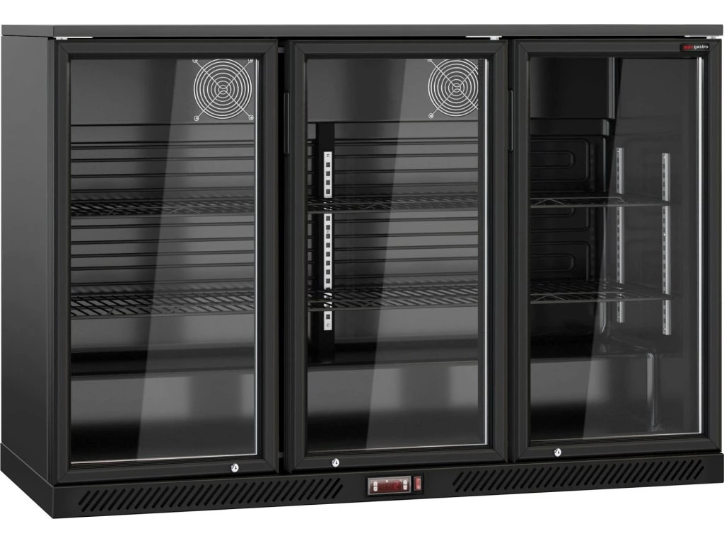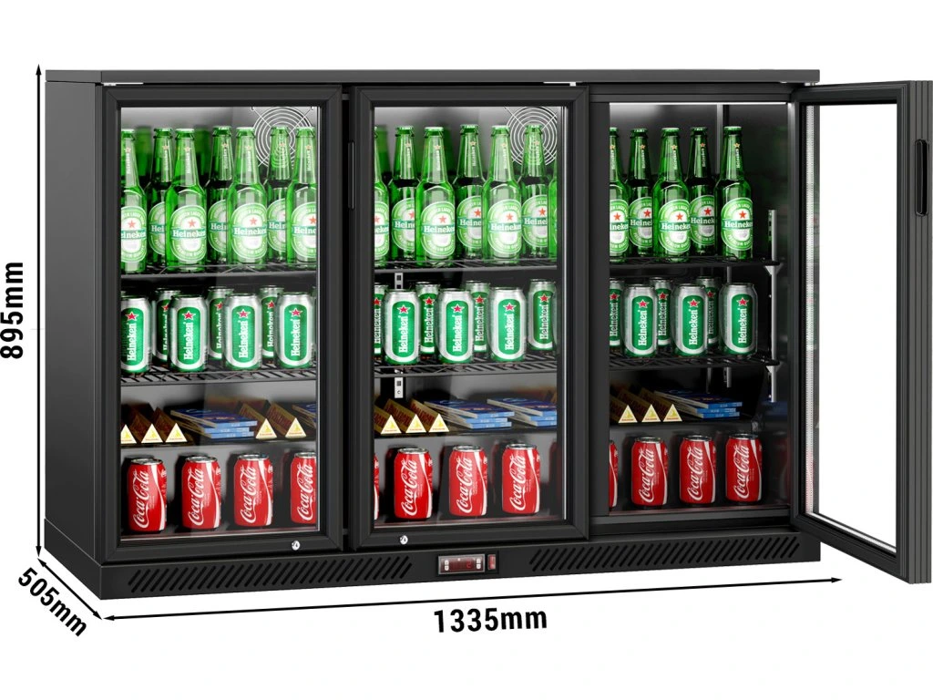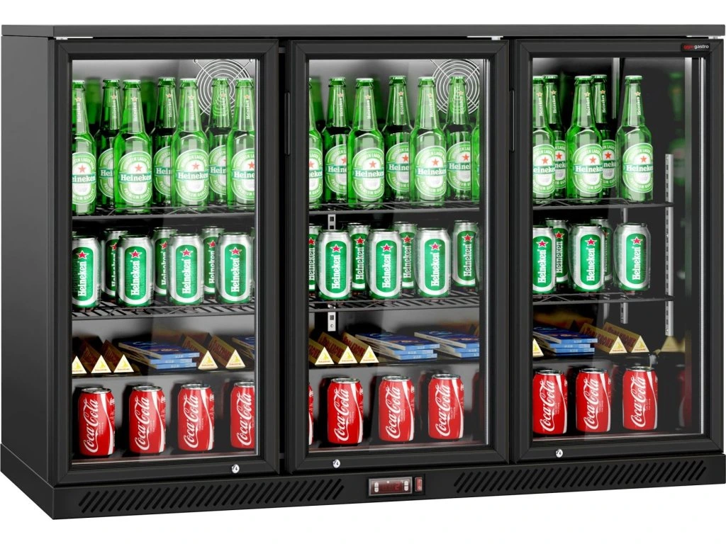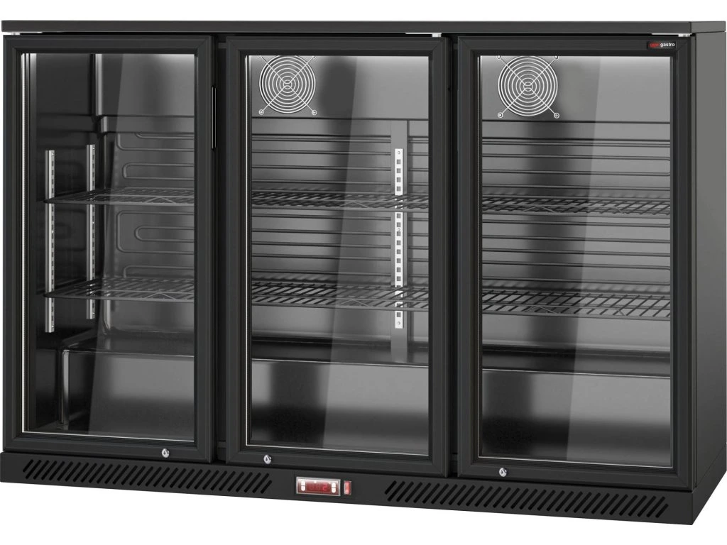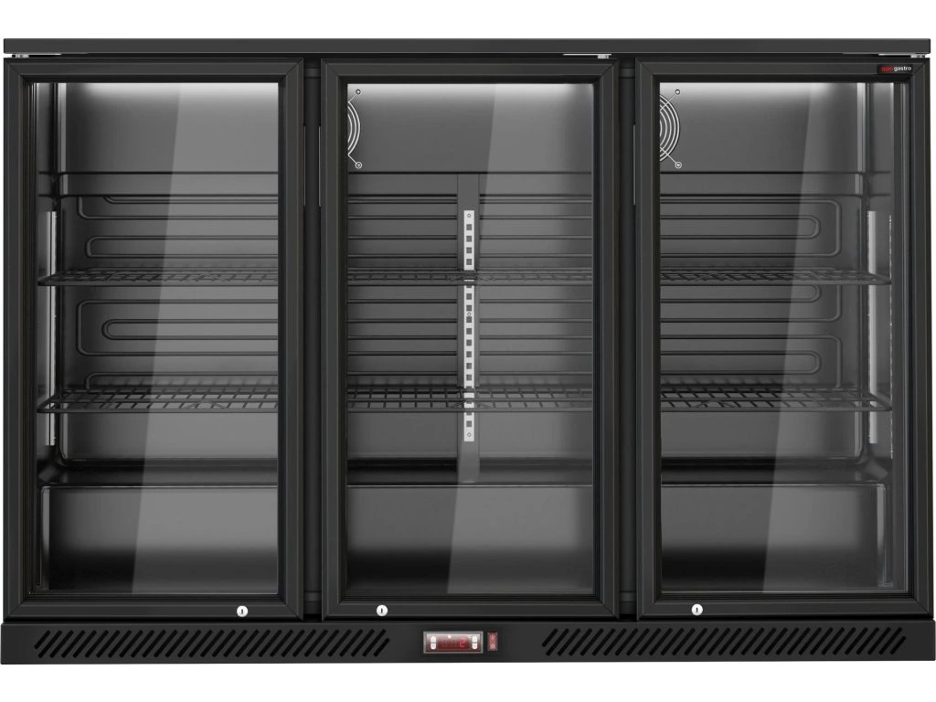 Barowy stół chłodniczy - 1330 mm - 320 litrów - z 3 szklanymi drzwiami na zawiasach - czarna obudowa & wnętrze