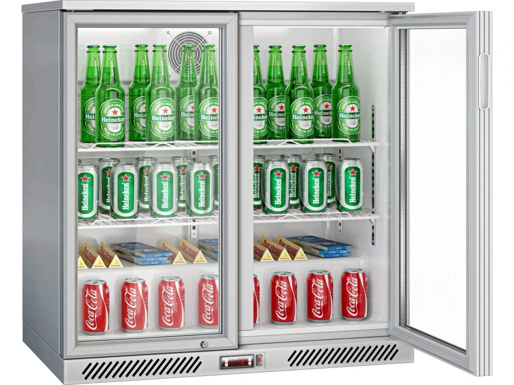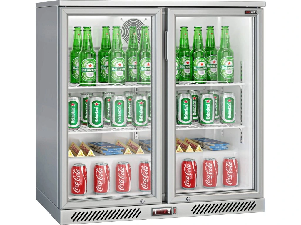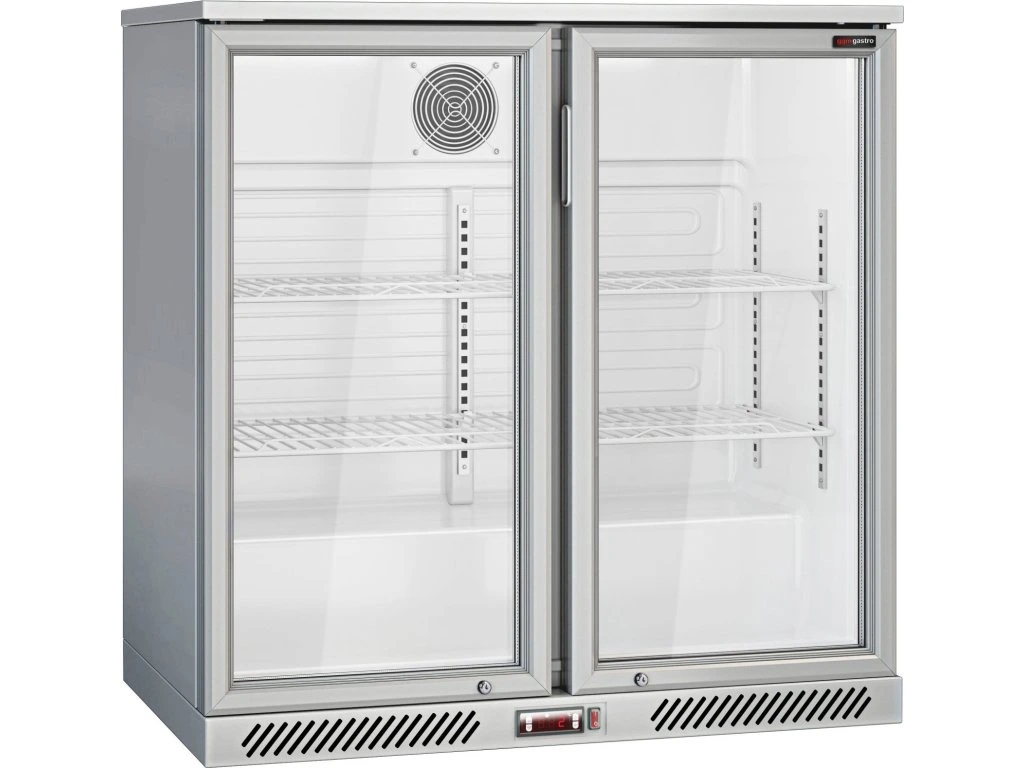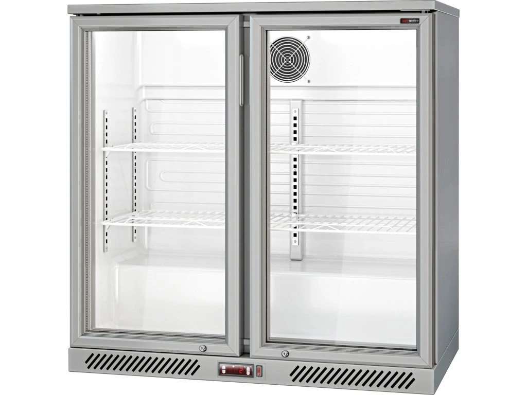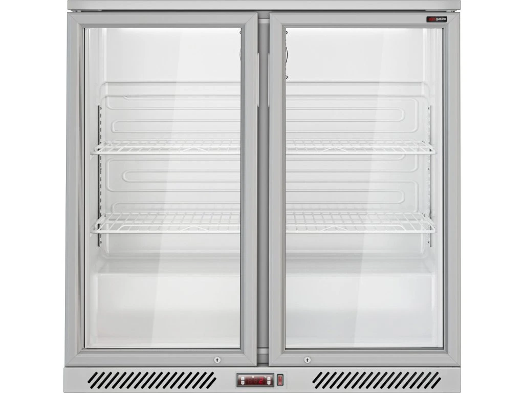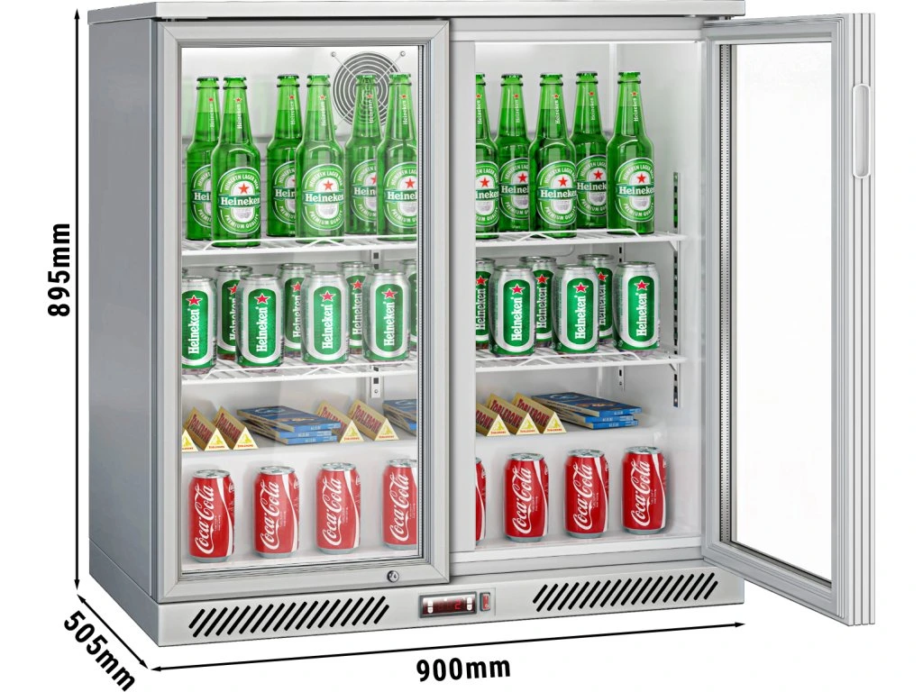 Barowy stół chłodniczy - 900 mm - 220 litrów - z 2 szklanymi drzwiami na zawiasach - Szara