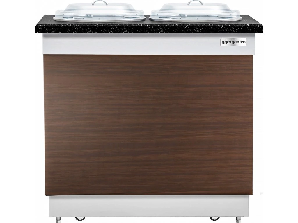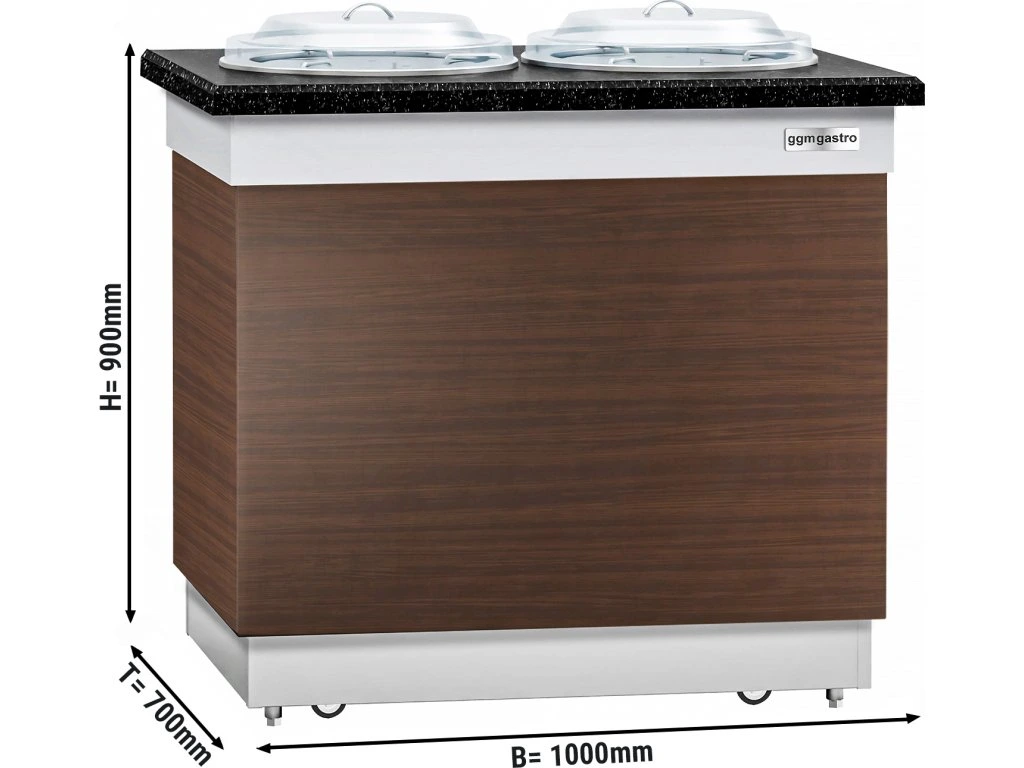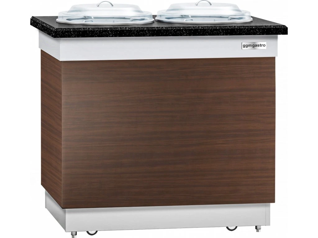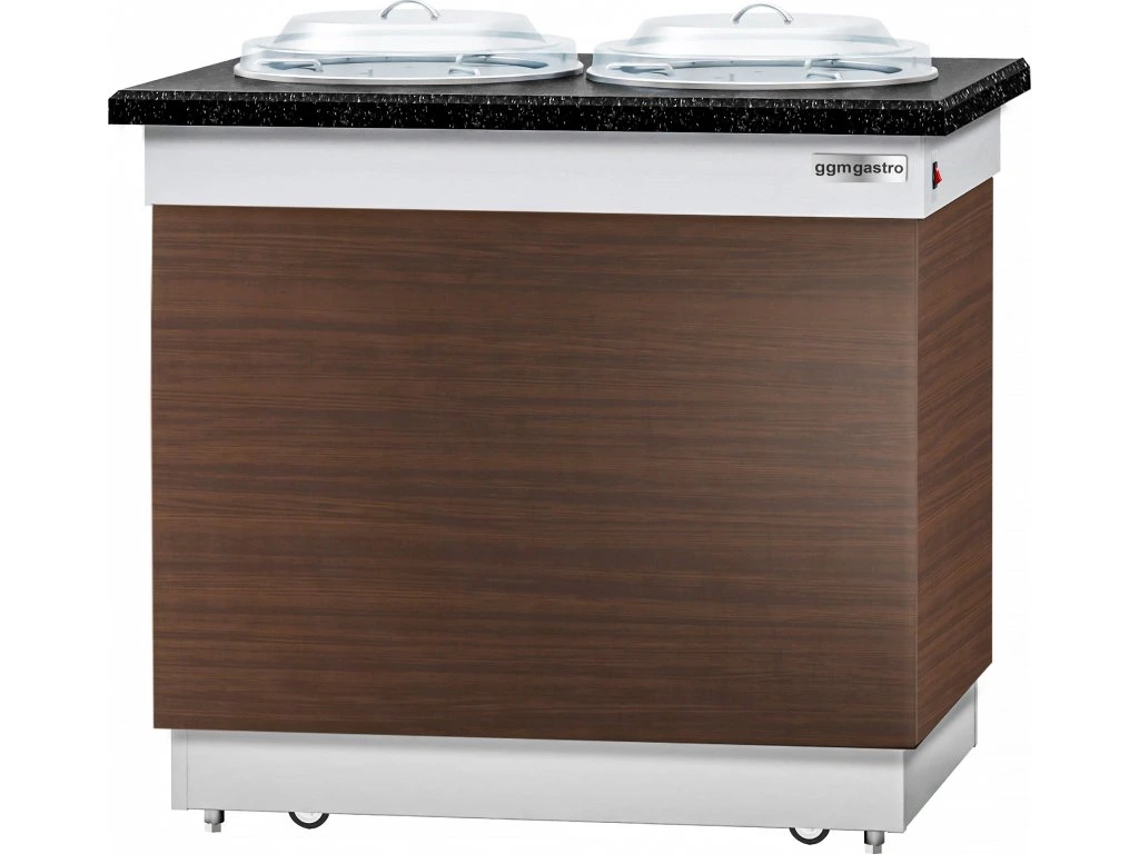 Dozownik talerzy DUBLIN - 700 mm - podgrzewany - na kółkach - 100 talerzy - blat roboczy z czarnego granitu