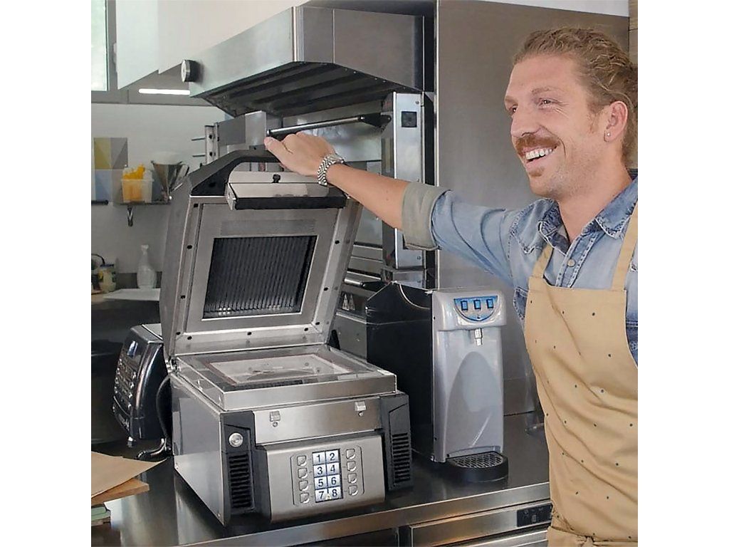 - Górna płyta opuszcza się na potrawę z idealnym naciskiem.