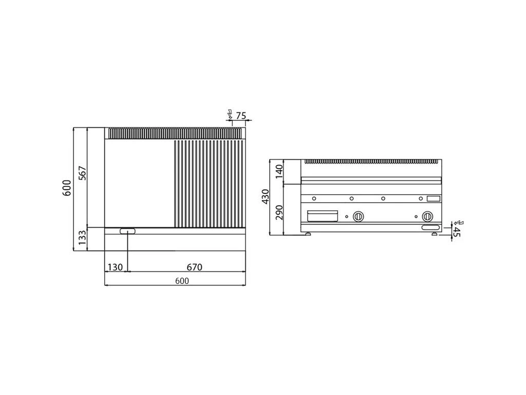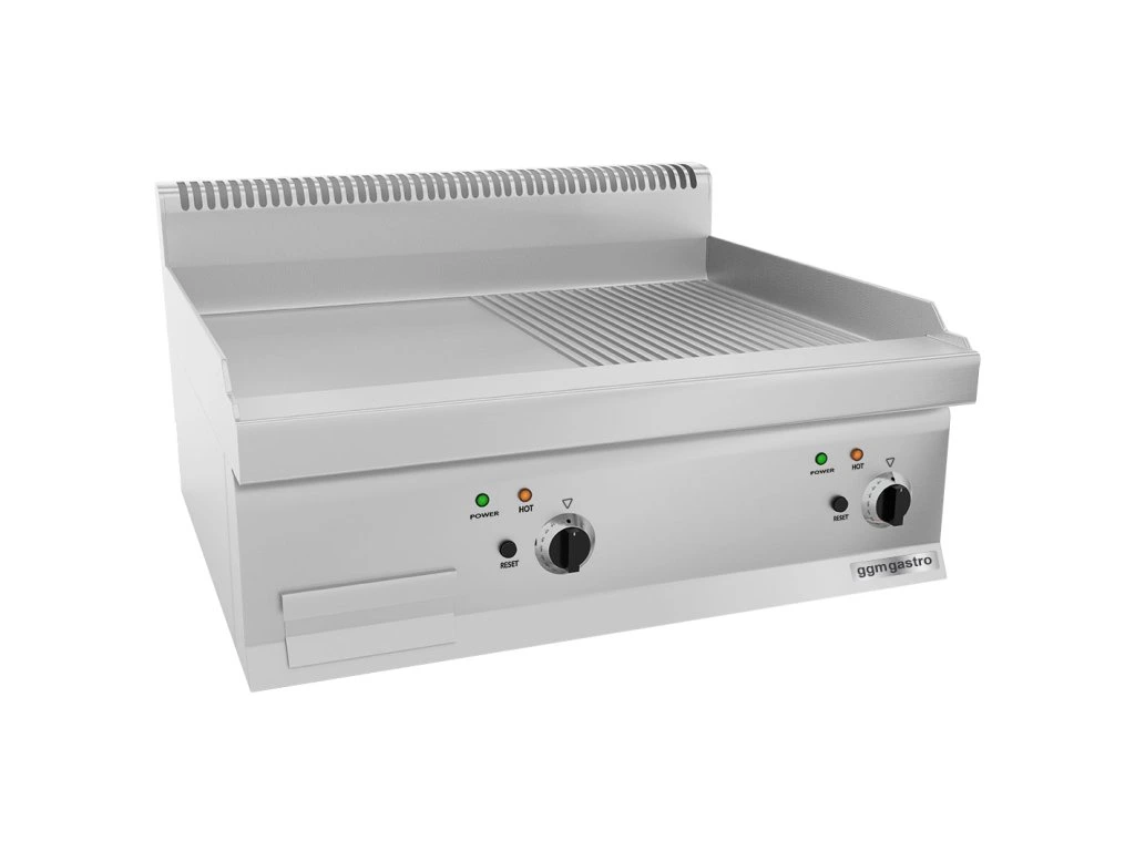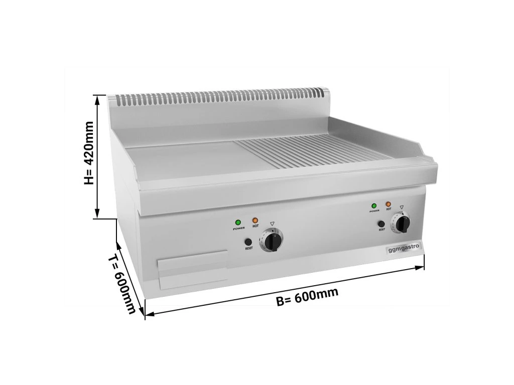 Płyta grillowa elektryczna komercyjna – stojąca – 2-strefowa (połowa gładka / połowa żebrowana) – 300°C – kompatybilna z Mario 600