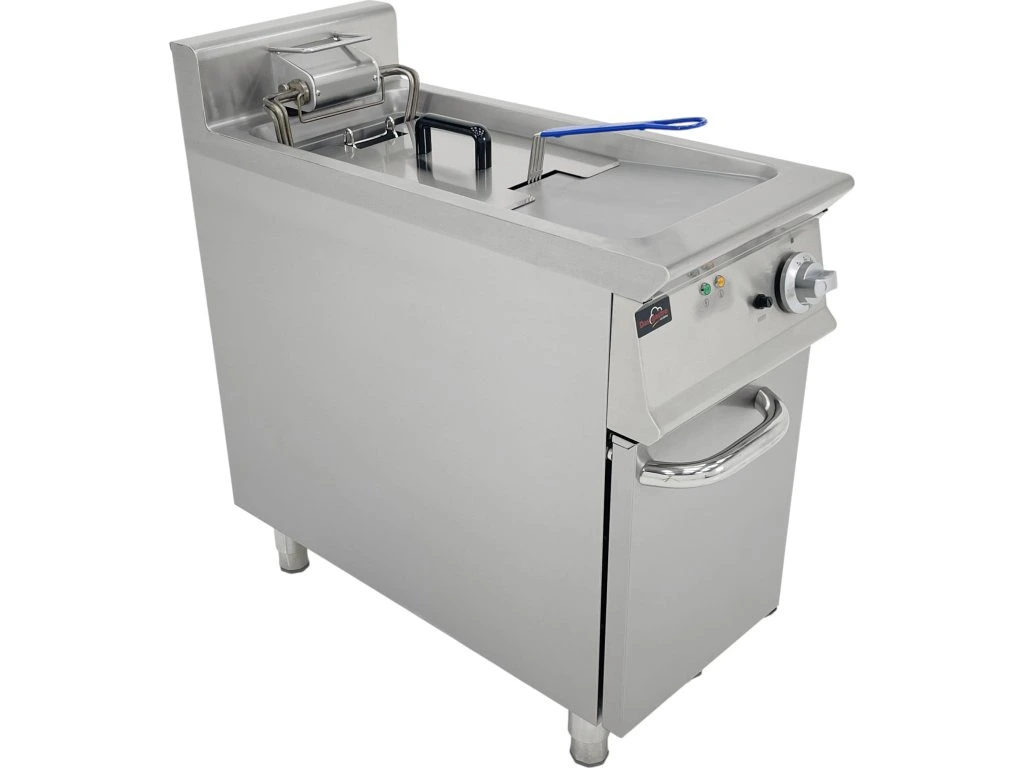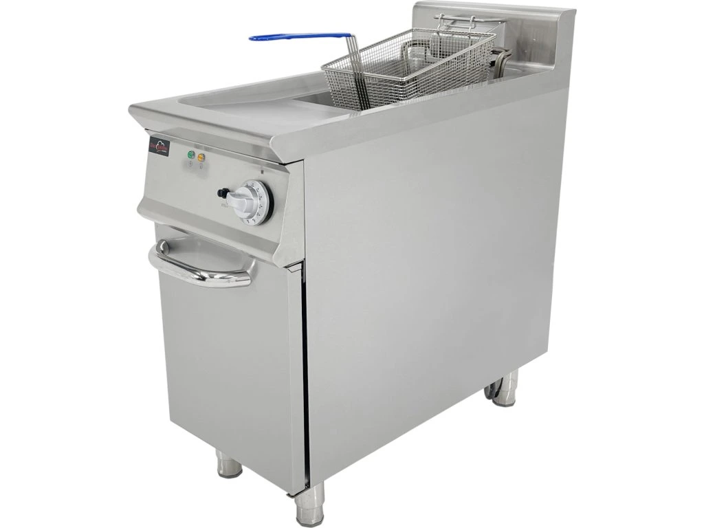 Elektryczna frytkownica jednootworowa z szafką dolną przeznaczona jest do profesjonalnej gastronomii, takiej jak restauracje, bistra, bary szybkiej obsługi, stołówki czy bary szybkiej obsługi. Służy do szybkiego i równomiernego podgrzewania potraw smażonych – frytek, mięsa, warzyw, ryb czy półproduktów. Dzięki wysokiej wydajności grzewczej i stabilnej regulacji temperatury zapewnia stałą jakość smażonych potraw, nawet przy dużym obciążeniu.