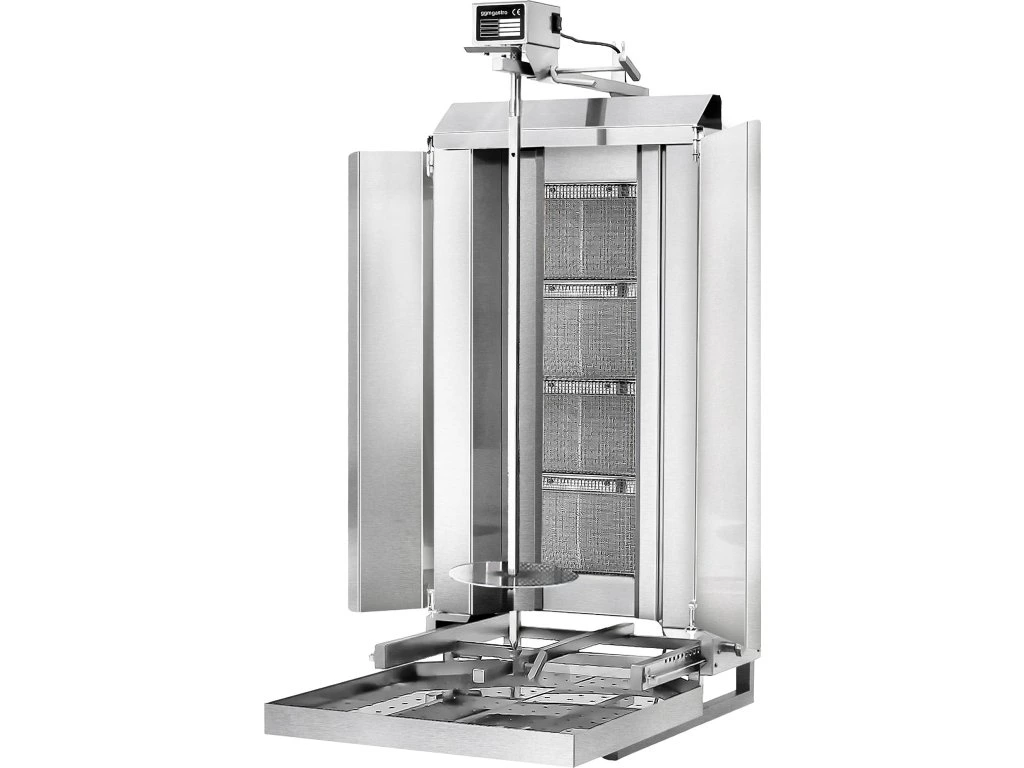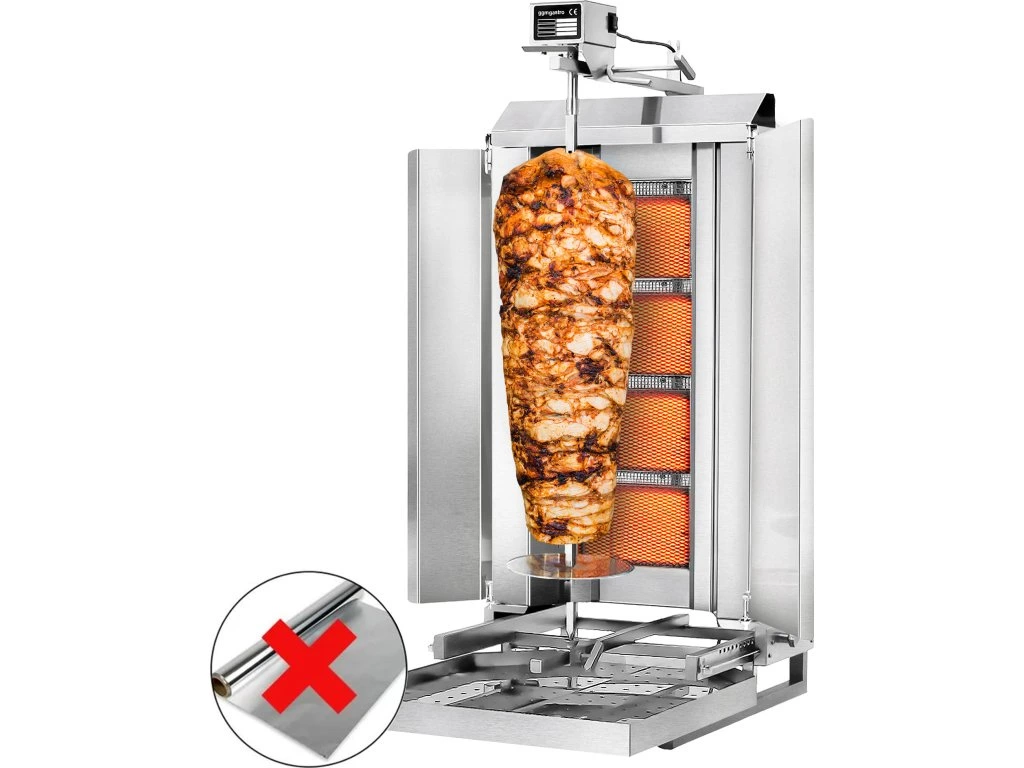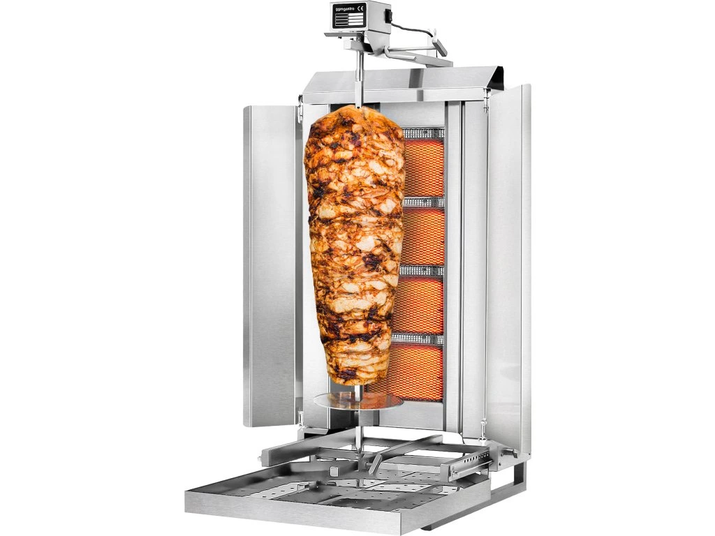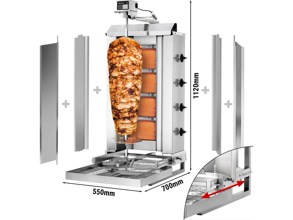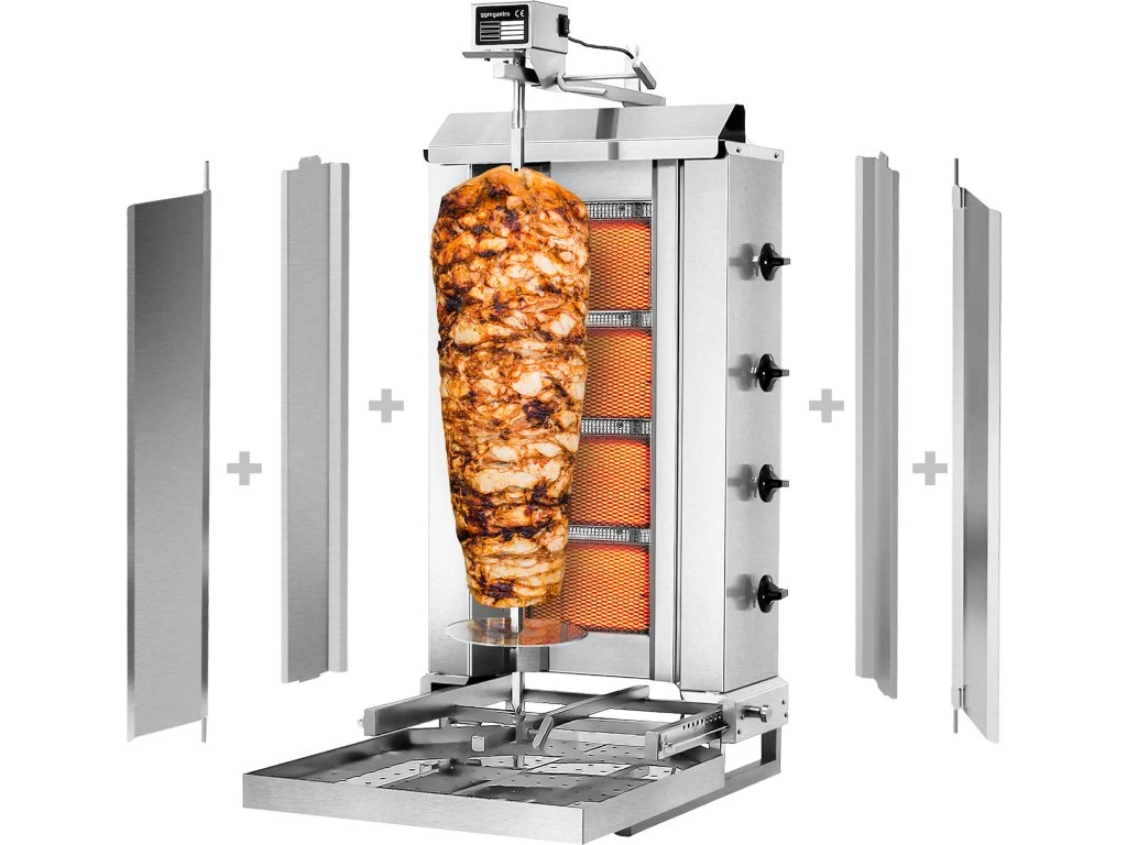 Grill gazowy do gyrosa/kebaba - mobilny - 4 palniki - maks. 60 kg - włącznie z płytą ochronną i drzwiami na zawiasach