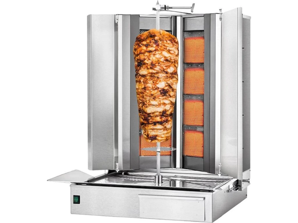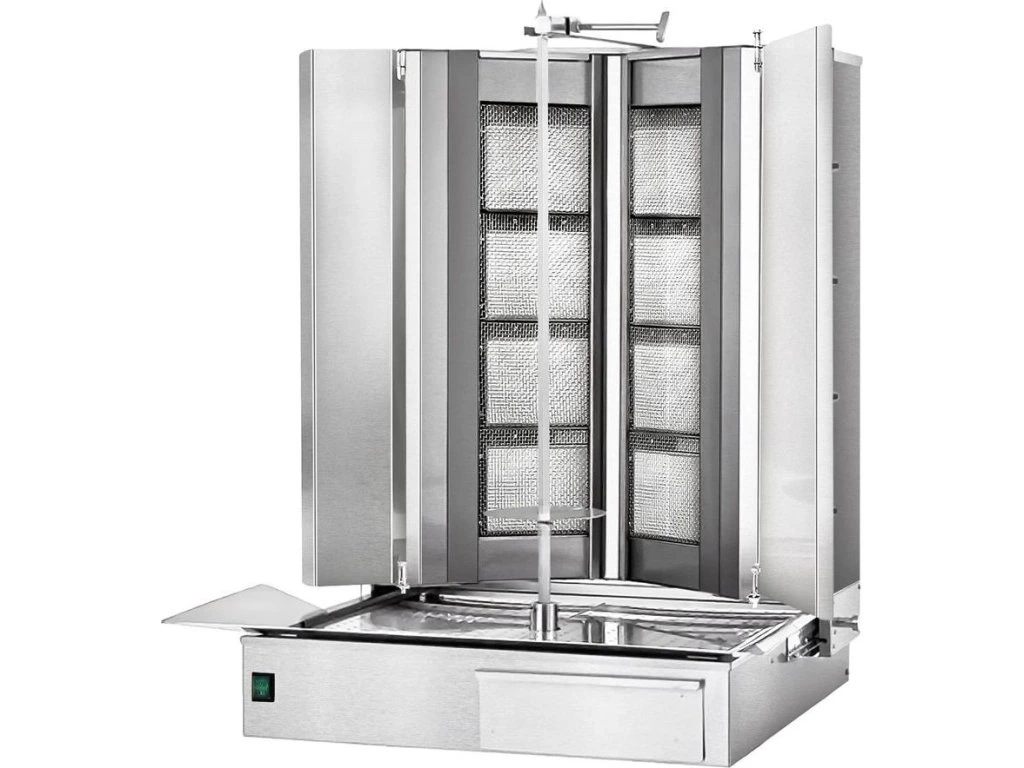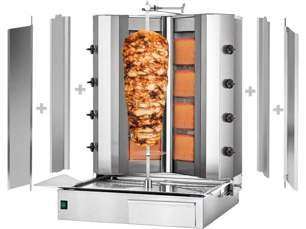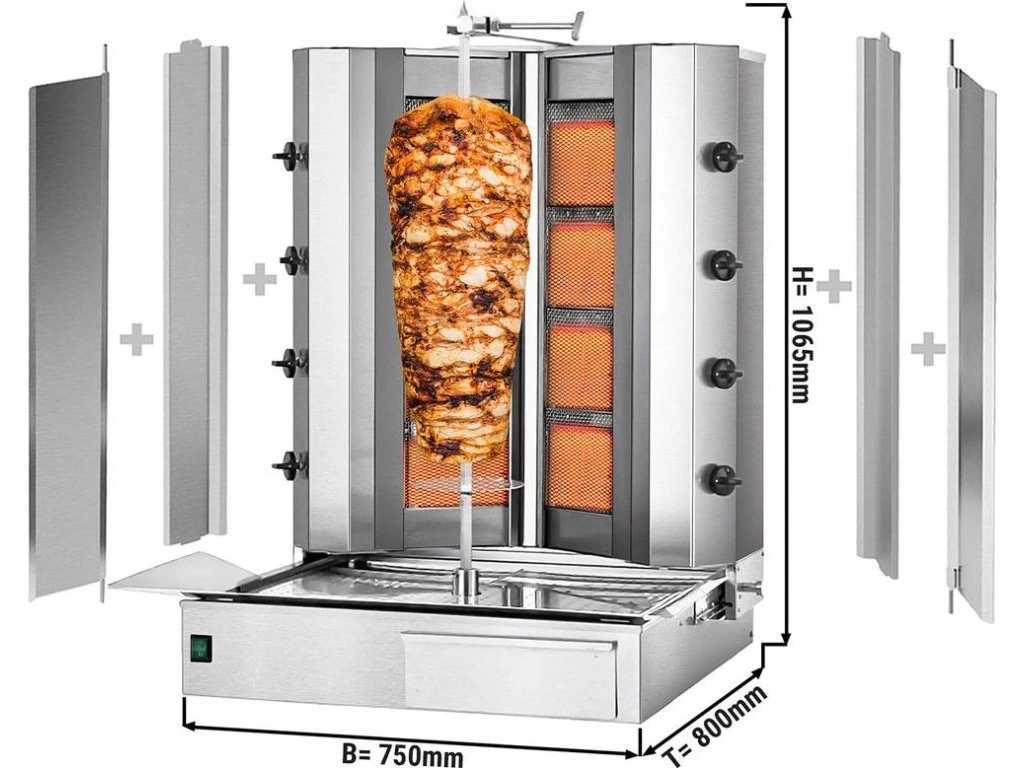 Grill gazowy gyro/döner - kształt V - 4+4 palniki - maks. 100 kg - z drzwiami na zawiasach