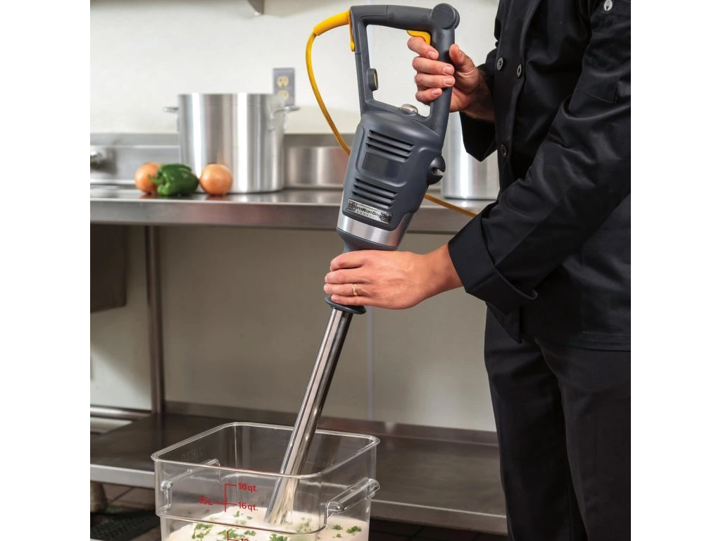 - Idealny do dużych kuchni do mieszania dużych ilości zup, sosów, sals i sosów sałatkowych.