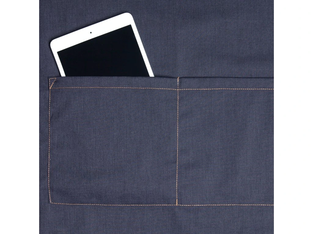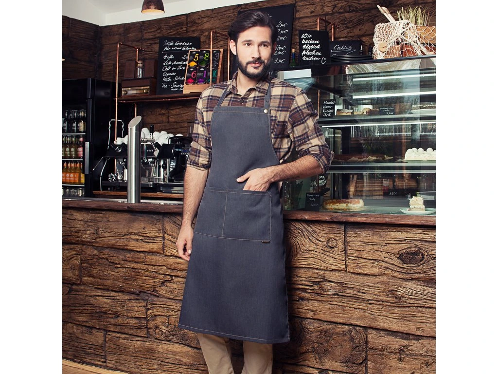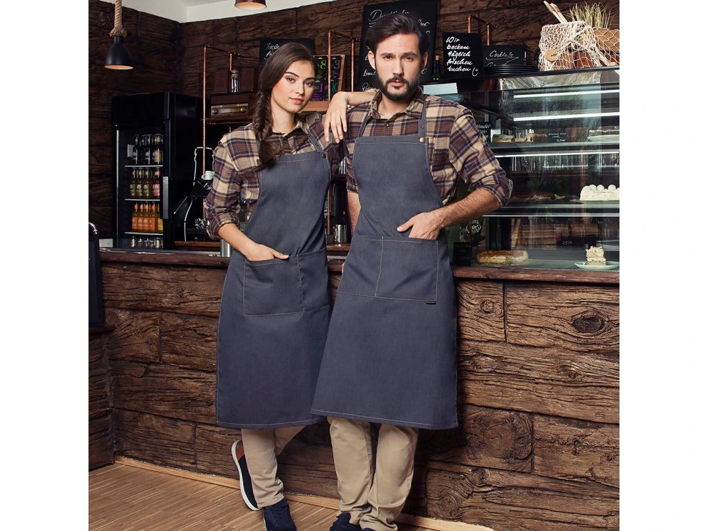 - Nowoczesny fartuch na szelkach z tasiemkami wykonany z tkaniny fartuchowej