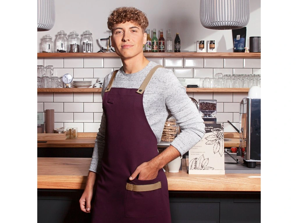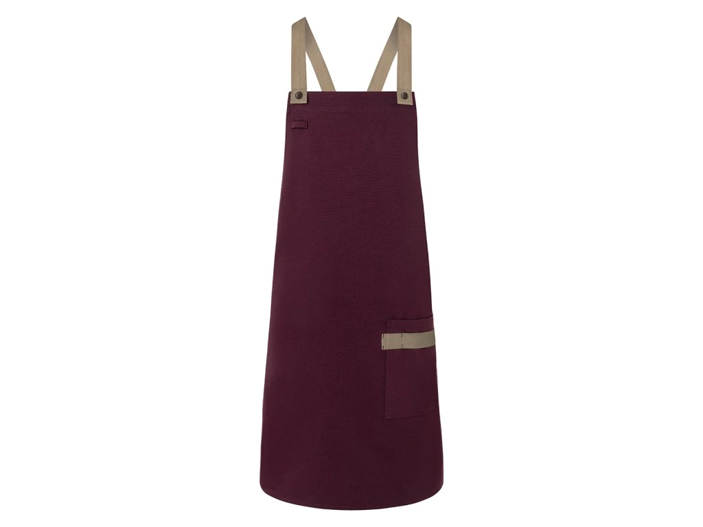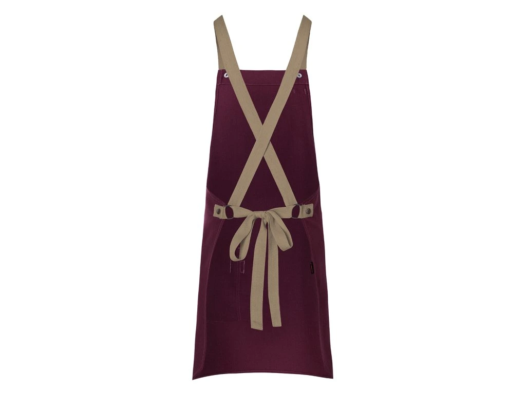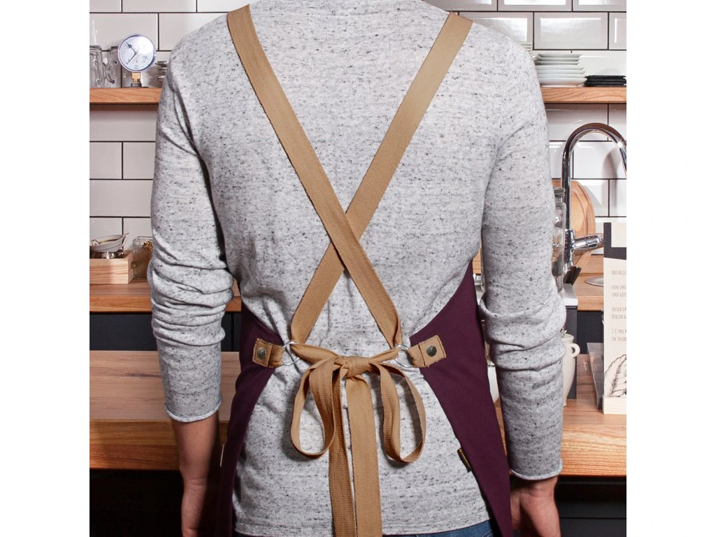 - Stylowy, modny fartuch na szelkach o skośnym kroju z krzyżowymi paskami odciążającymi szyję