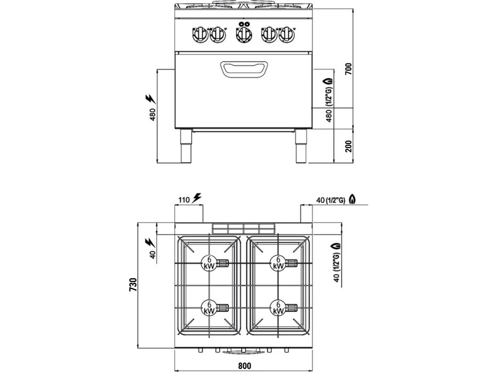 Płyta gazowa - 24 kW - 4 palniki - włącznie z piekarnikiem elektrycznym - 4,7 kW