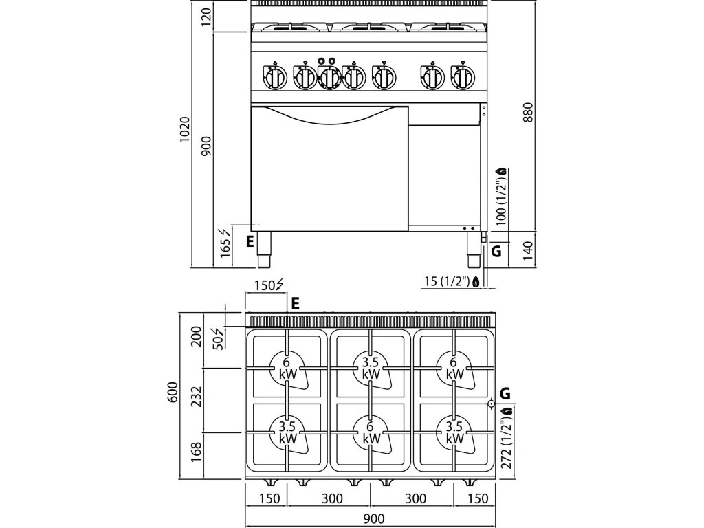 Kuchenka gazowa - 28,5 kW - 6 palników - Piekarnik elektryczny z wentylatorem - 3 kW