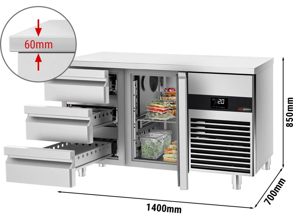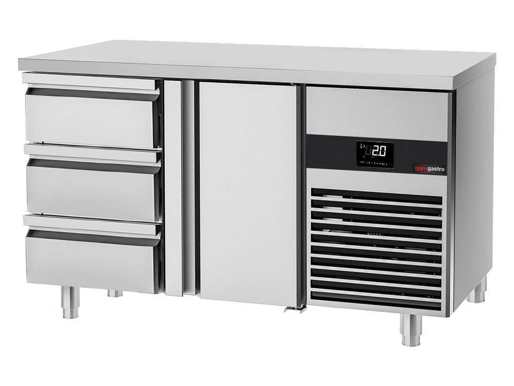 Stół chłodniczy PREMIUM - 1400x700 mm - z 1 drzwiami i 3 szufladami - włącznie z płytą do krojenia w kolorze czerwonym