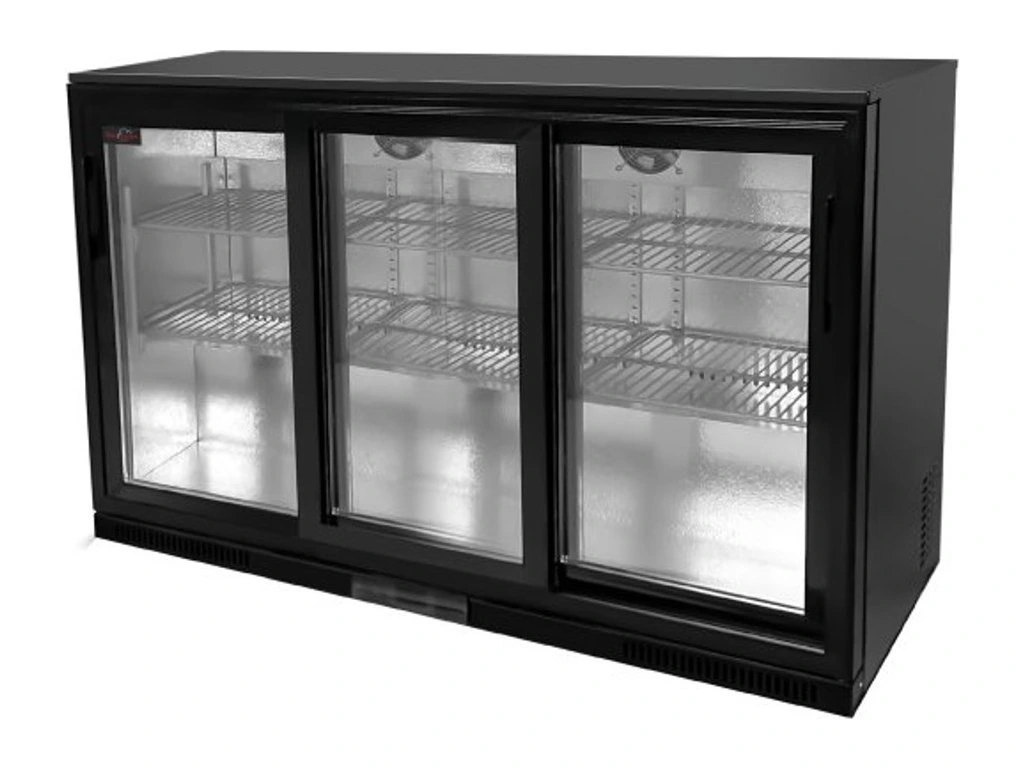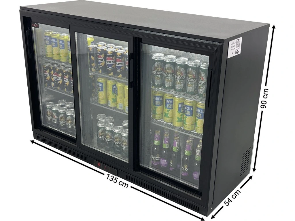 Lodówka barowa - 1350 x 540 x 900 mm, z 3 szklanymi drzwiami i 2 półkami - czarna