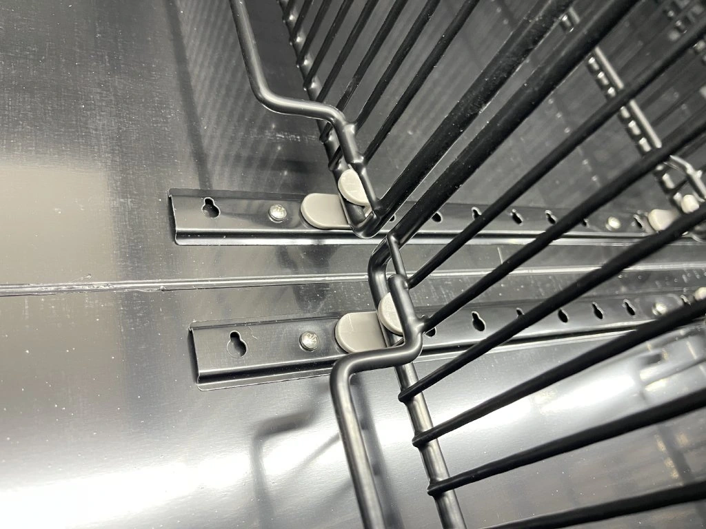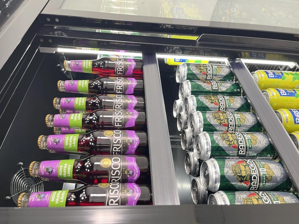 - Oszczędność miejsca – każda połowa witryny zawiera 4 czarne, regulowane półki, co umożliwia elastyczną organizację napojów