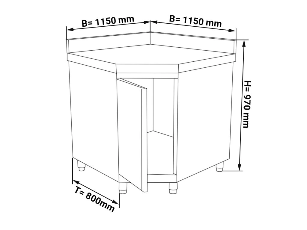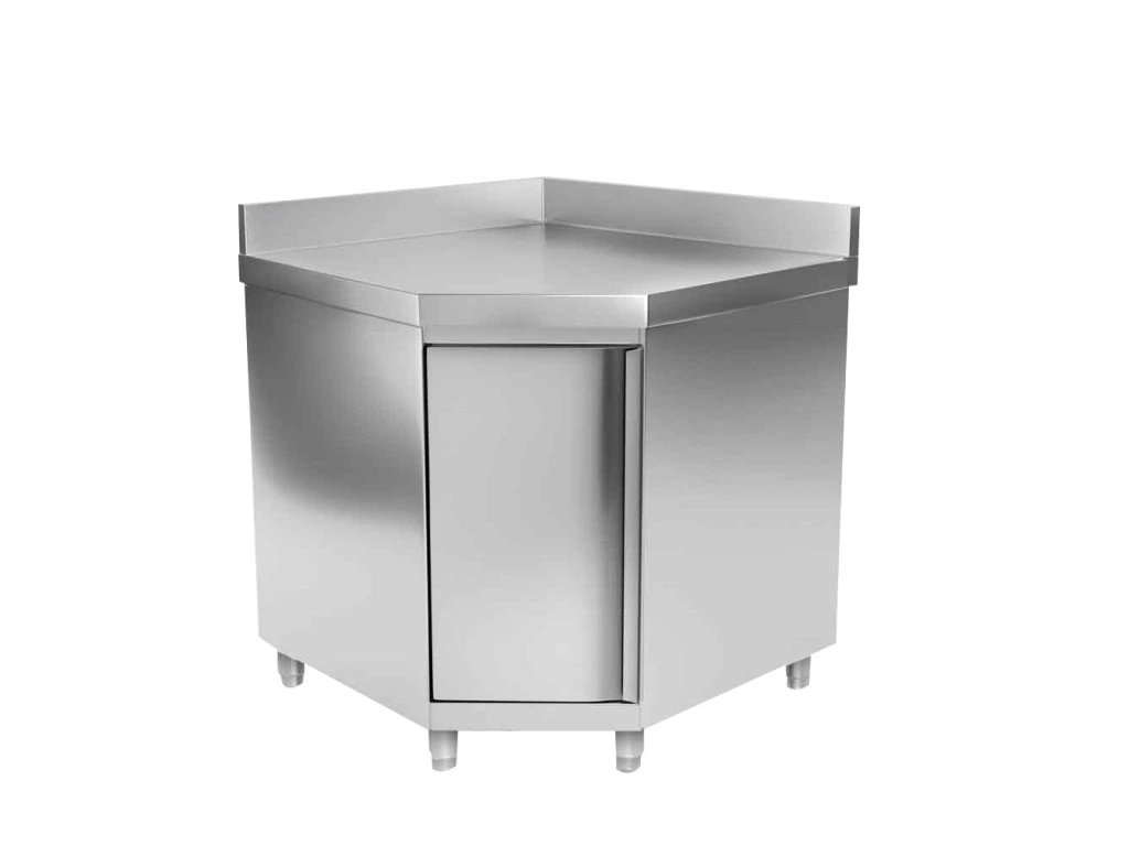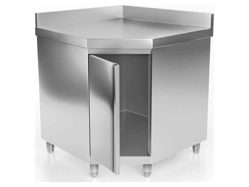 Narożna szafka robocza PREMIUM ze stali nierdzewnej z drzwiami na zawiasach i podstawą 1150x800 mm