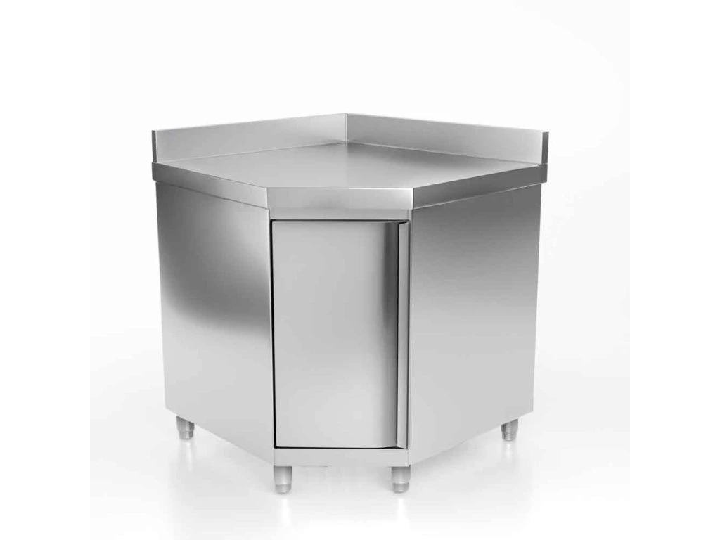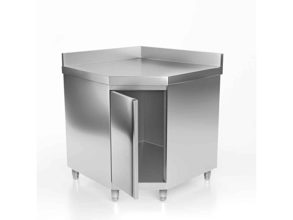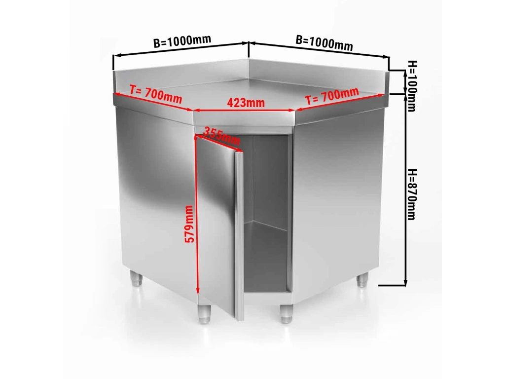 Narożna szafka robocza PREMIUM ze stali nierdzewnej z drzwiami skrzydłowymi & panelem tylnym 1000x700 mm