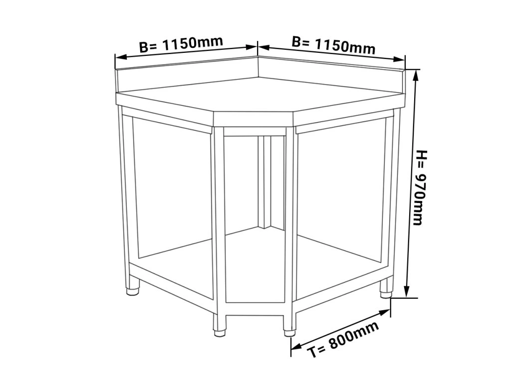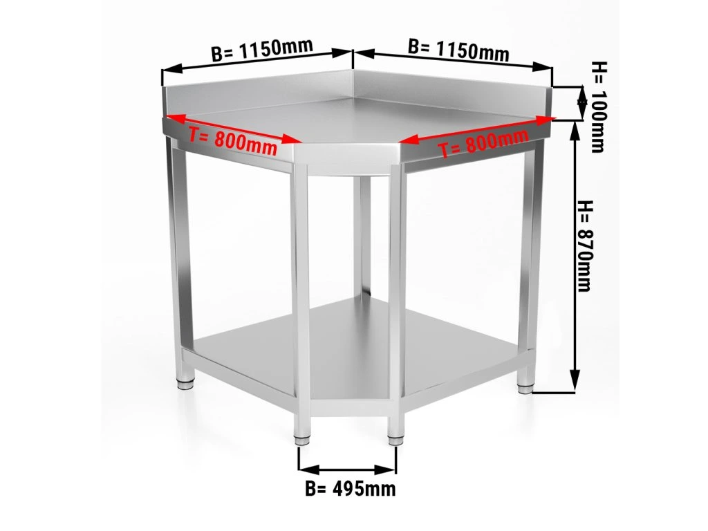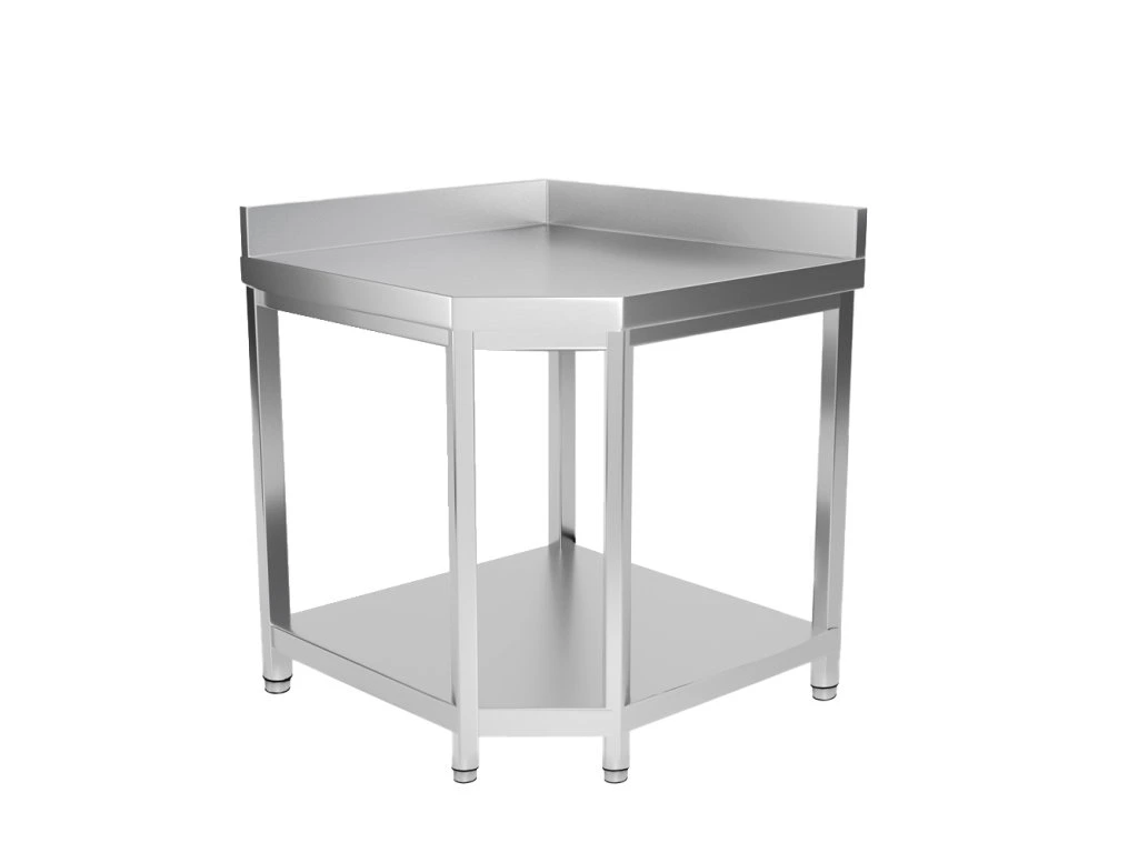 Narożny stół roboczy PREMIUM ze stali nierdzewnej - 1150x800 mm - z dolną półką & stojakiem