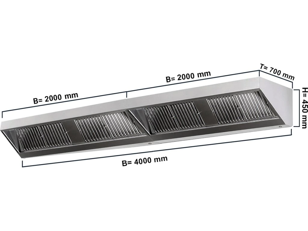 - Wymiary zewnętrzne na okap (Szer.xGłęb.xWys.): 2000 x 700 x 450 mm