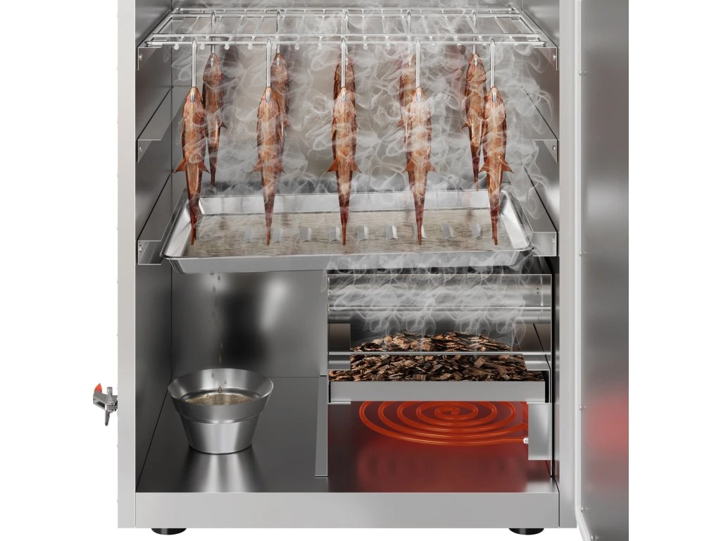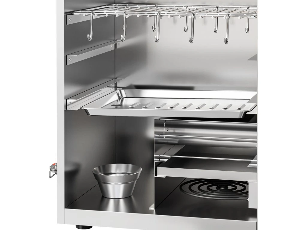 - Tacka ociekowa nad tacą wędzarniczą zapobiega kapaniu tłuszczu na zrębki wędzarnicze i zapewnia zdrowy proces wędzenia.
