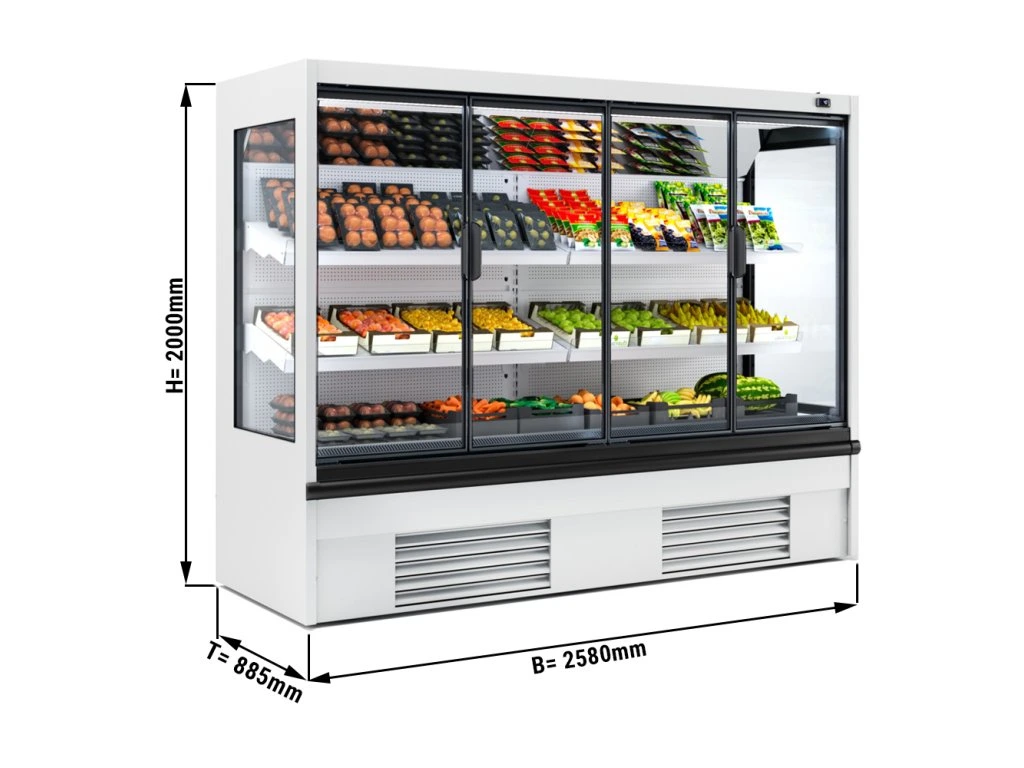 Półka chłodnicza naścienna - 2580 mm - 1408 litrów - z oświetleniem LED, izolowanymi szklanymi drzwiami & 2 półkami