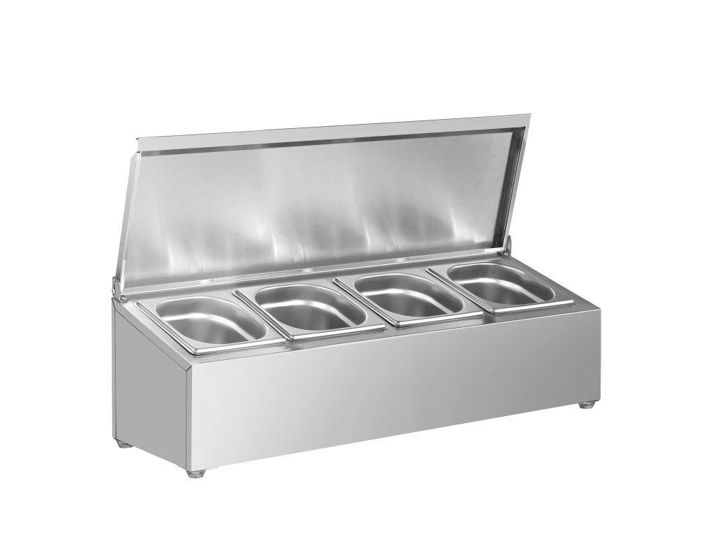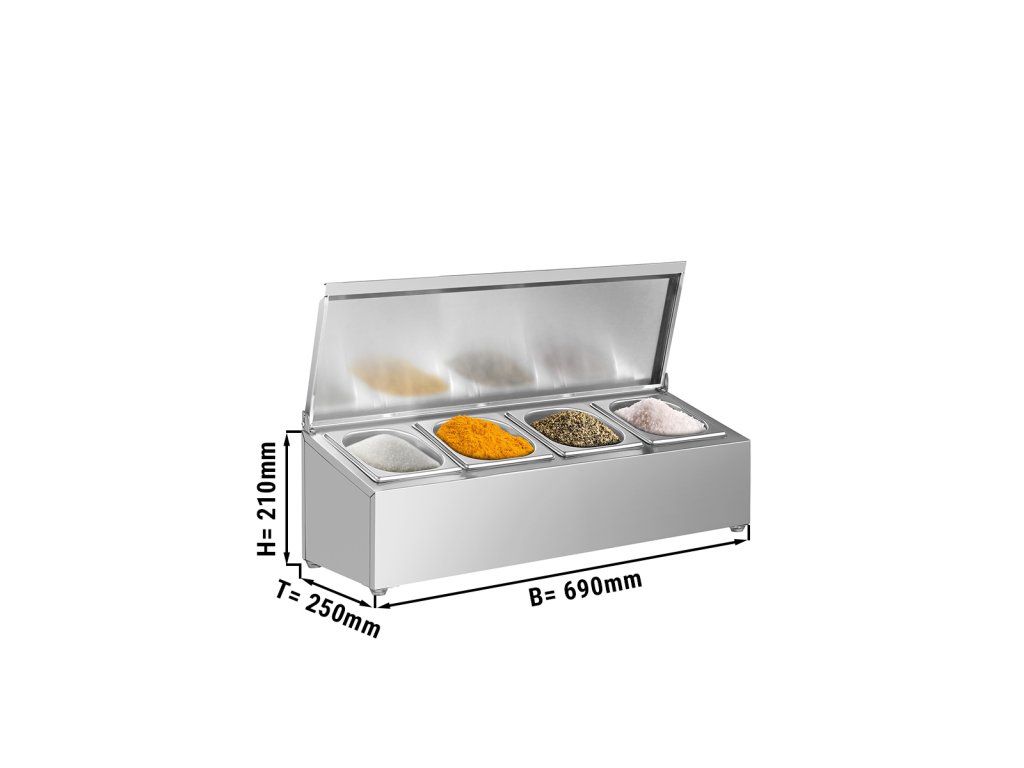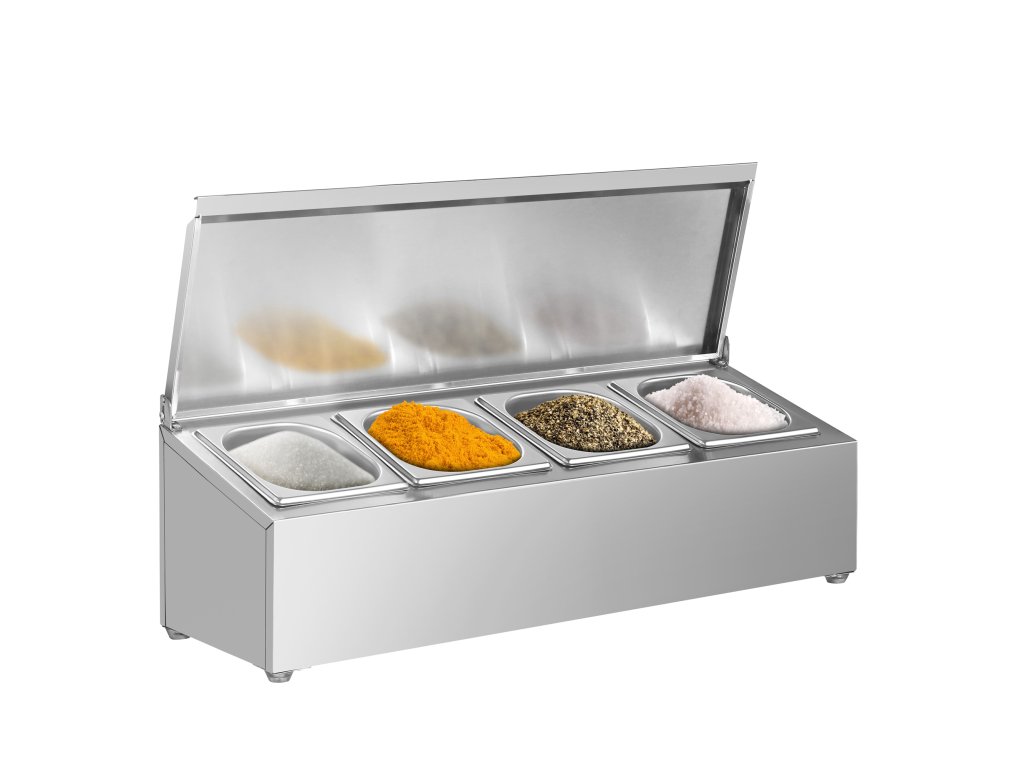 Pojemnik na przyprawy Gastronorm GN 1/6 – zawiasowa pokrywa ze stali nierdzewnej – 690×250×210 mm – 4×GN 1/6