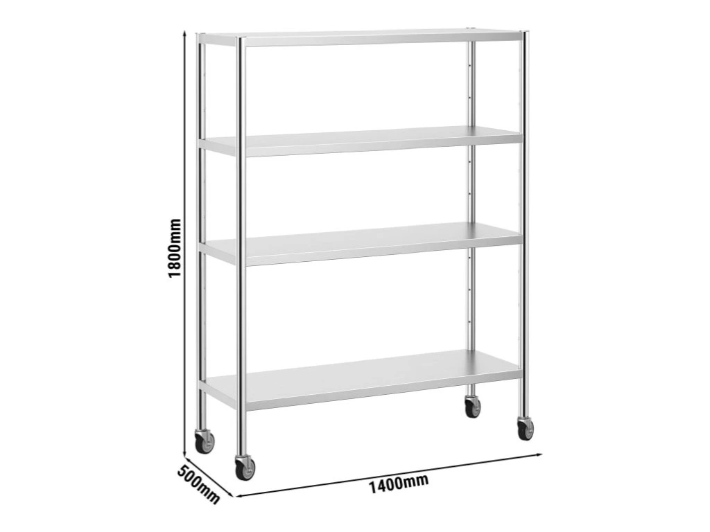 Półka ze stali nierdzewnej PREMIUM - 1,4 x 0,5 m - z 4 półkami (REGULOWANA) - w zestawie 4 kółka