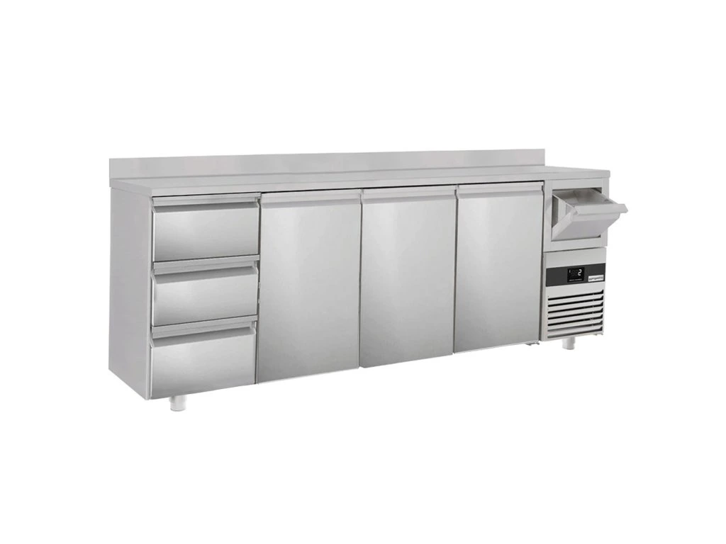 Stół barowy i chłodniczy do napojów PREMIUM - 2690x600 mm - 3 drzwi, 3 szuflady, panel tylny i kołatka do kawy