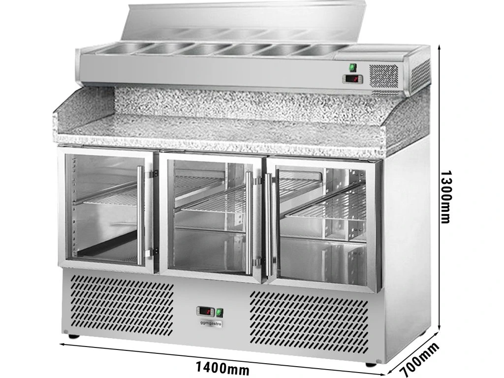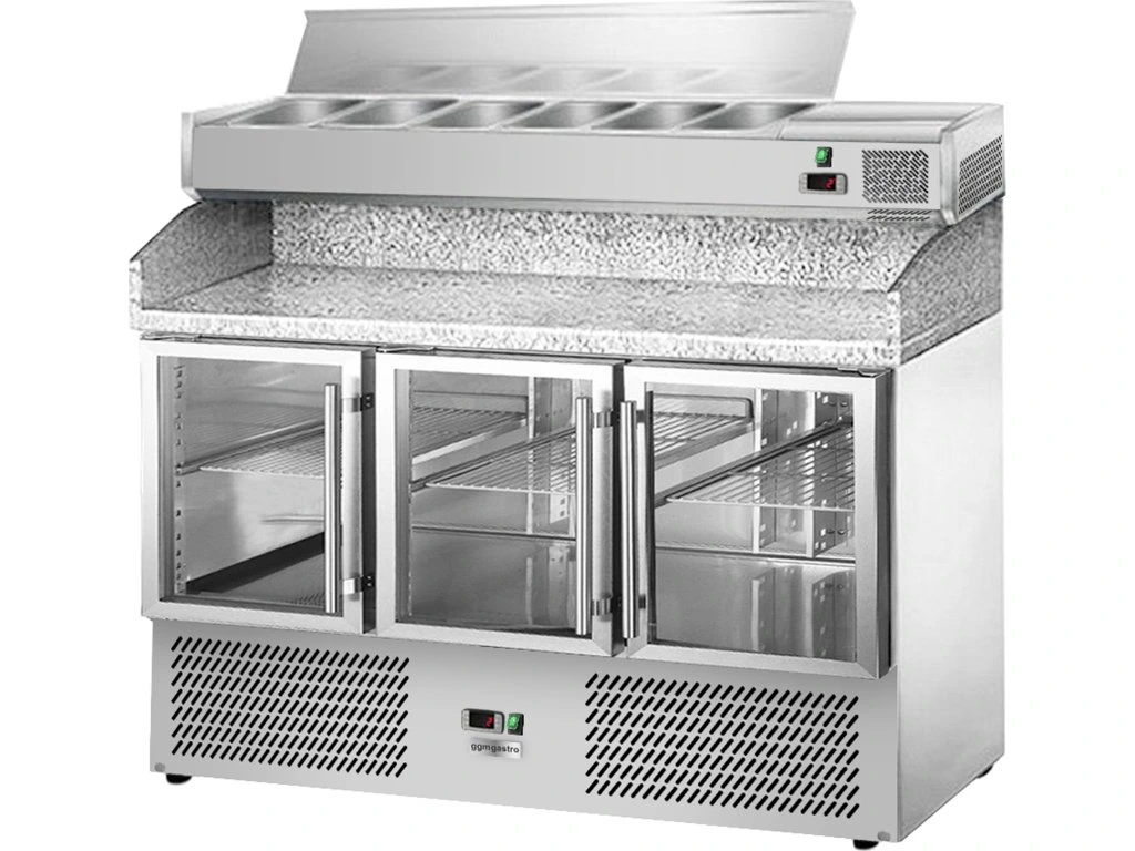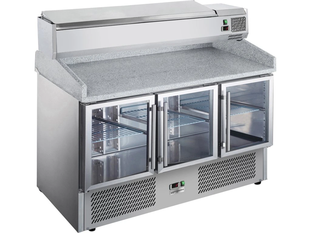 Stół chłodniczy do pizzy ECO - 1400x700mm - z 3 szklanymi drzwiami - włącznie z witryną chłodniczą nadstawną - 6x GN 1/4