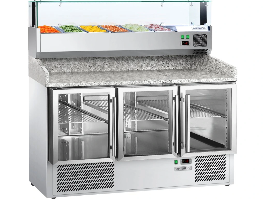 Stół chłodniczy do pizzy ECO - 1400x700mm - z 3 szklanymi drzwiami - z witryną chłodniczą nadstawną - 6x GN 1/4