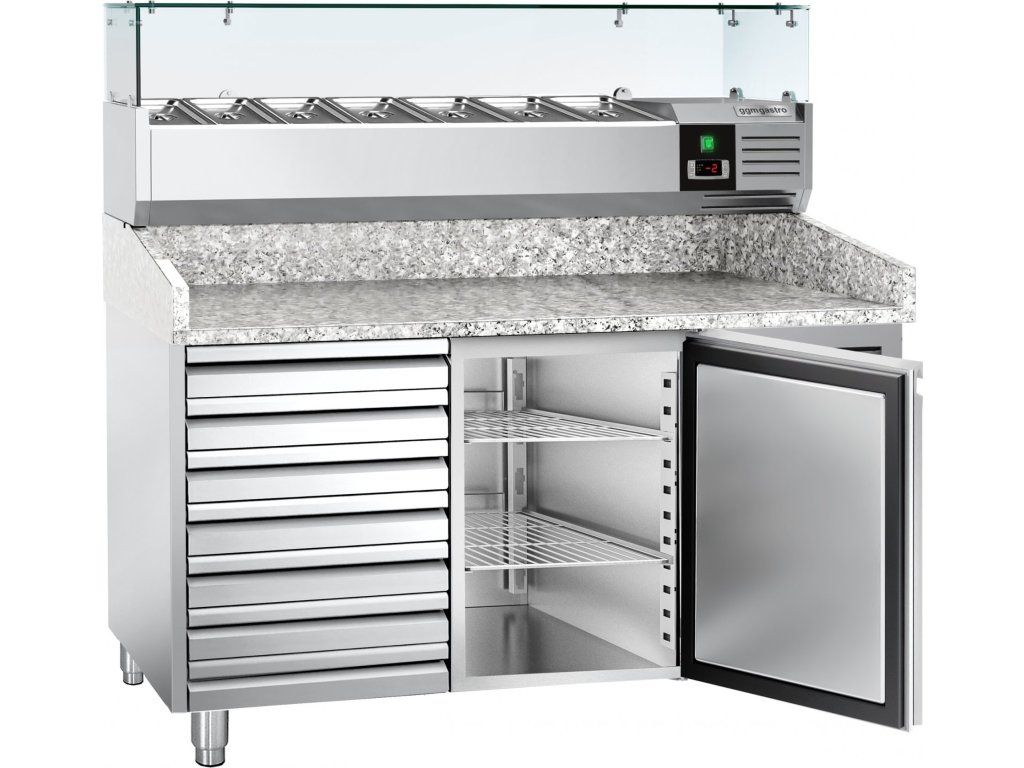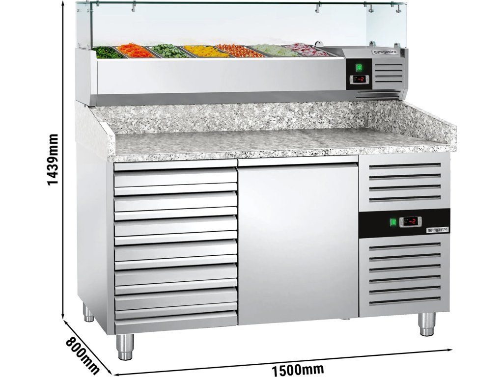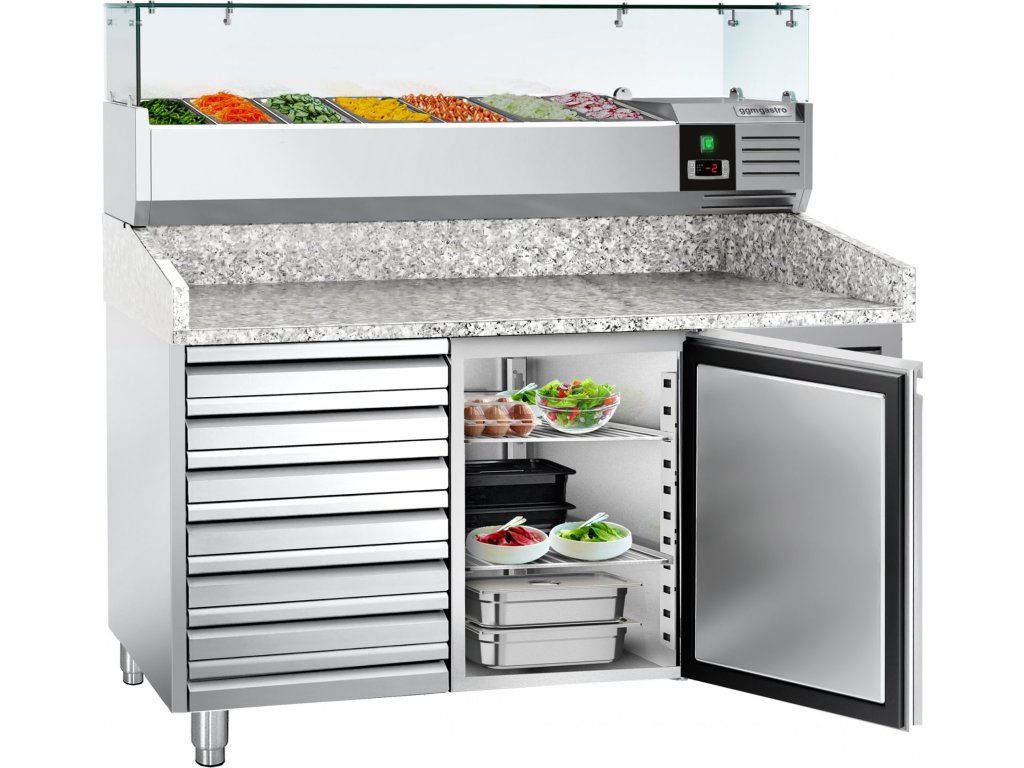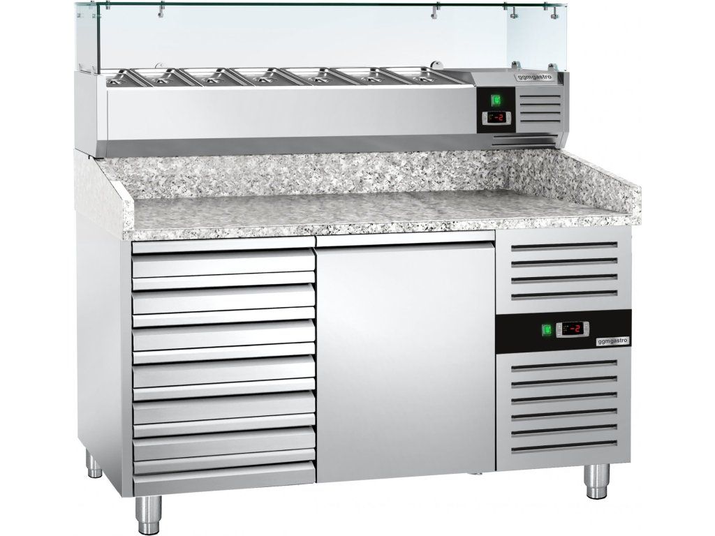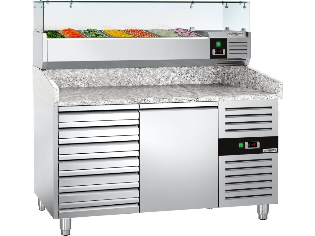Stół chłodniczy do pizzy ECO - 1500x800mm - z 1 drzwiami i 7 szufladami - włącznie z witryną chłodniczą nadstawną - 7x GN 1/4