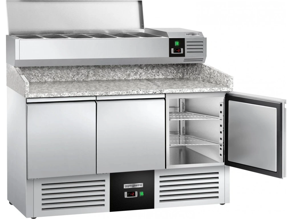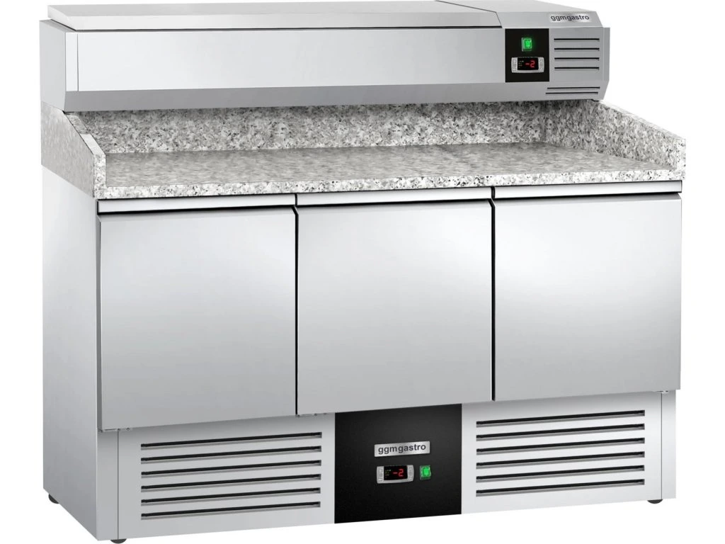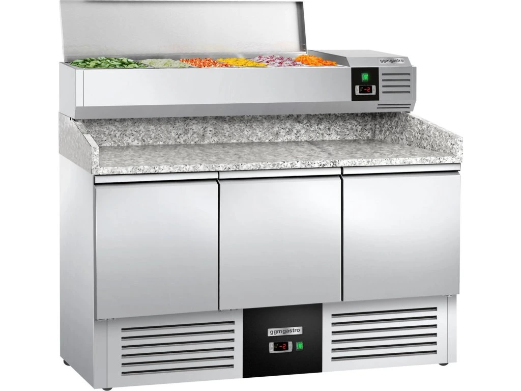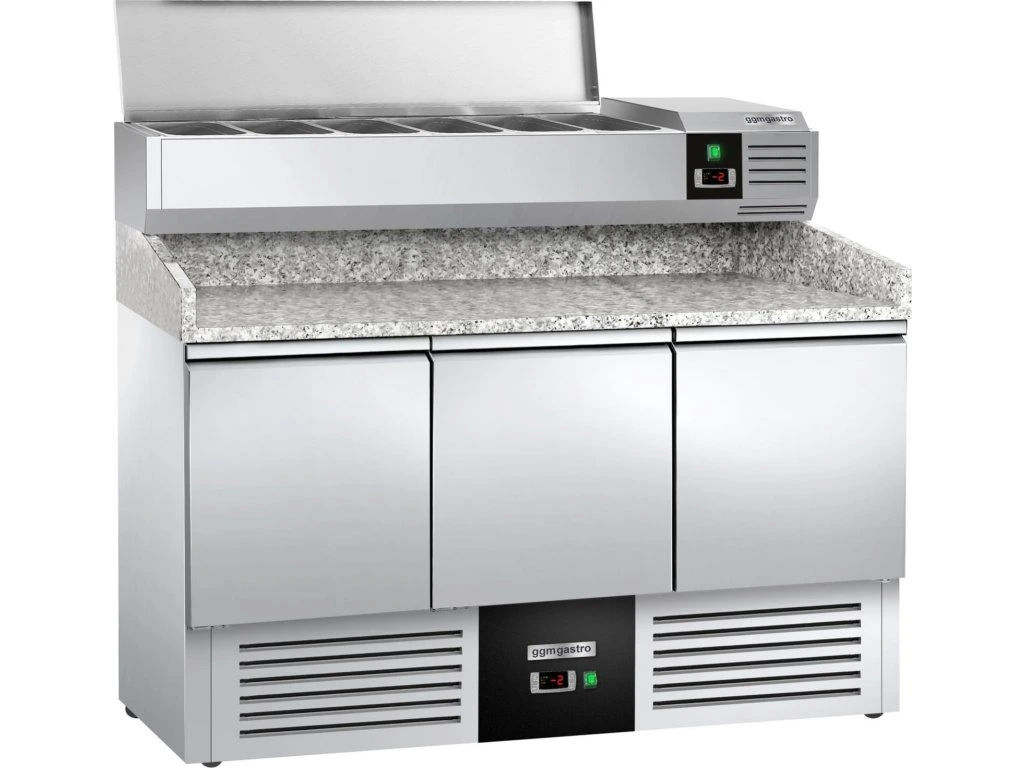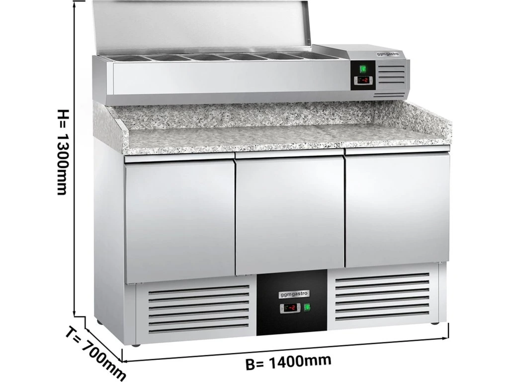 Stół chłodniczy do pizzy PREMIUM - 1400x700mm - 3 drzwi - włącznie z witryną chłodniczą nadstawną - 6x GN 1/4