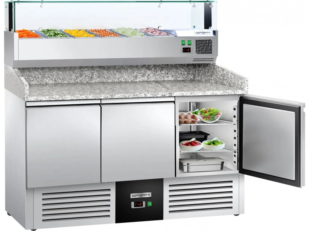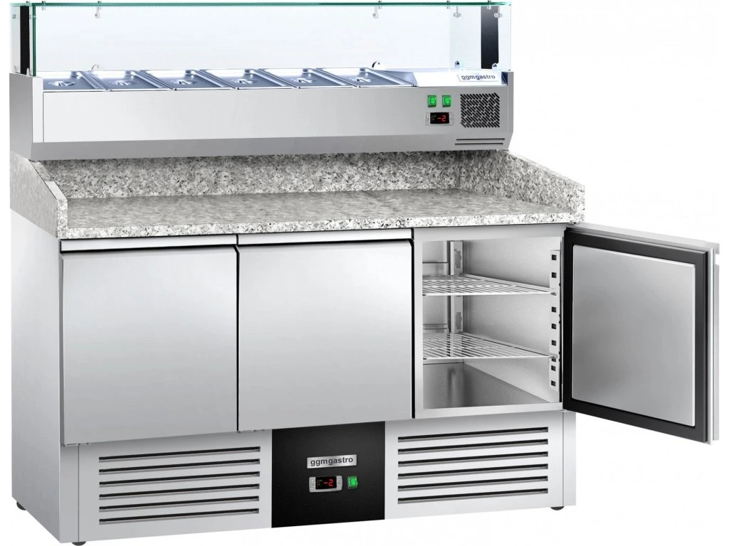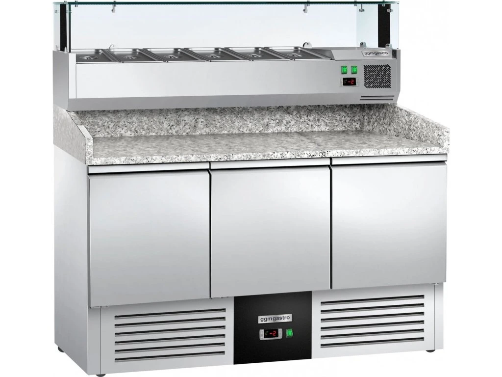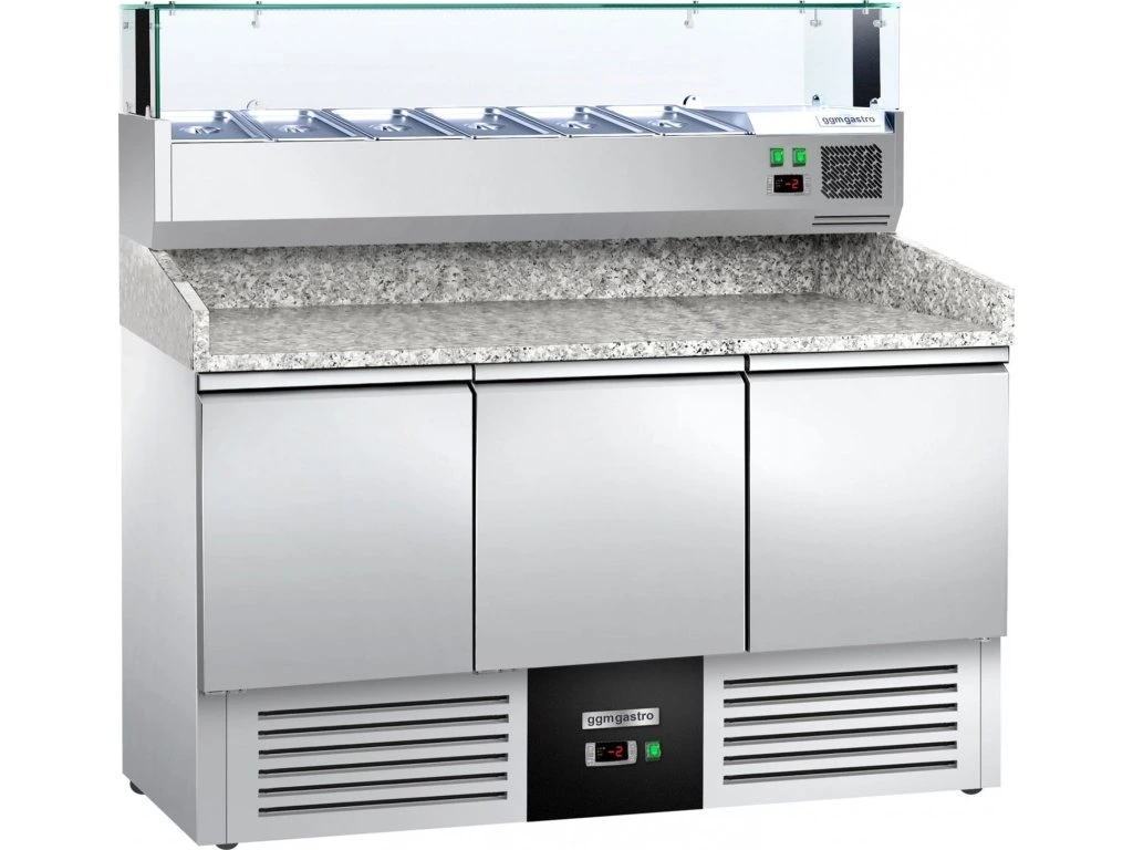 Stół chłodniczy do pizzy PREMIUM - 1400x700mm - 3 drzwi - włącznie z witryną chłodniczą nadstawną - 6x GN 1/4