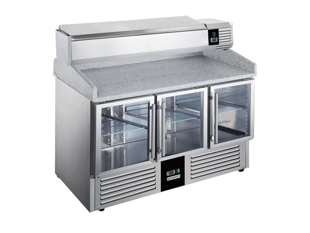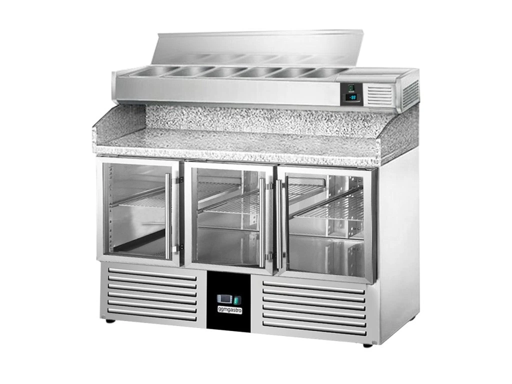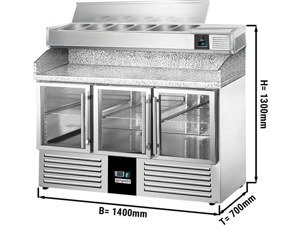 Stół chłodniczy do pizzy PREMIUM - 1400x700mm - 3 szklane drzwi - włącznie z witryną chłodniczą nadstawną - 6x GN 1/4