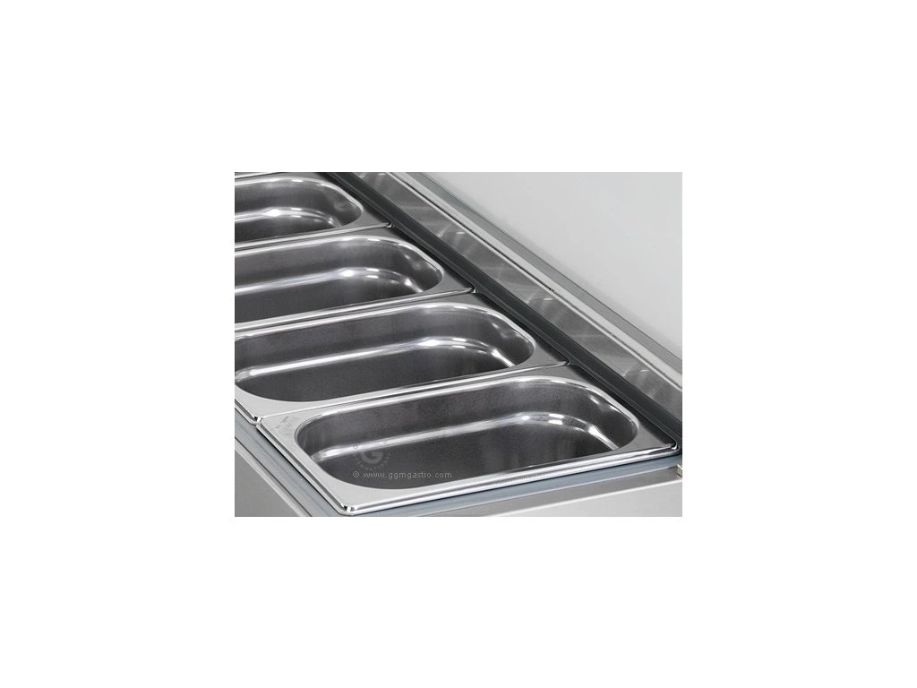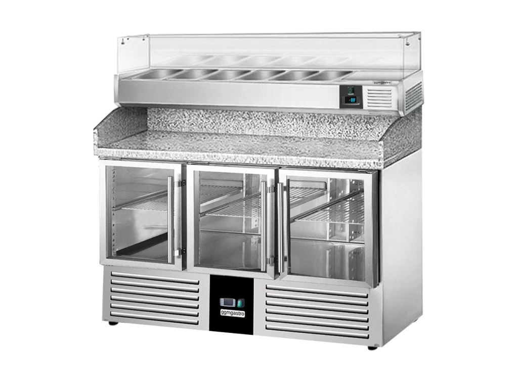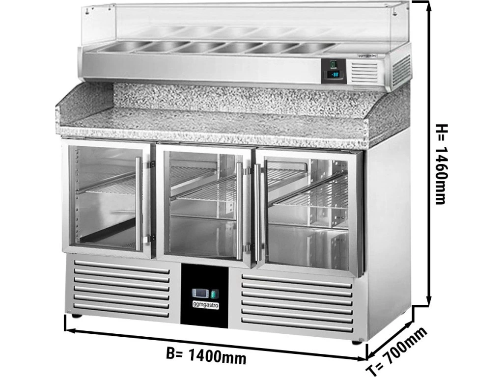 Stół chłodniczy do pizzy PREMIUM - 1400x700mm - 3 szklane drzwi - włącznie z witryną chłodniczą nadstawną - 6x GN 1/4