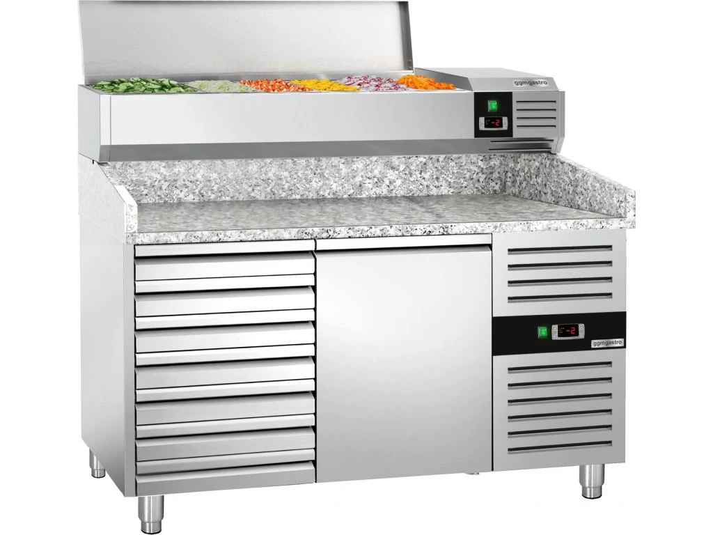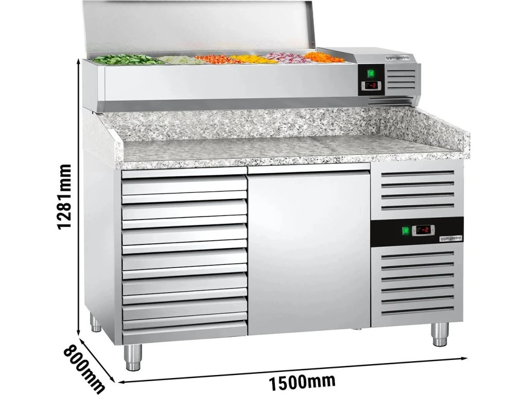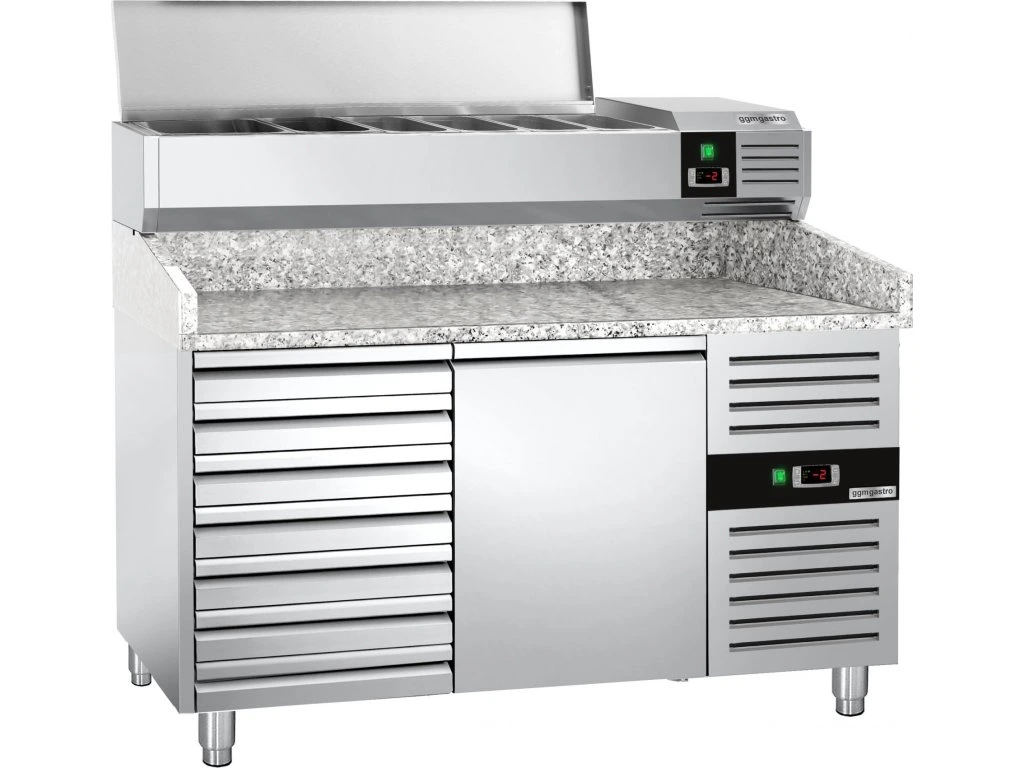 Stół chłodniczy do pizzy PREMIUM - 1500x800mm - z 1 drzwiami i 7 szufladami - włącznie z witryną chłodniczą nadstawną - 6x GN 1/3