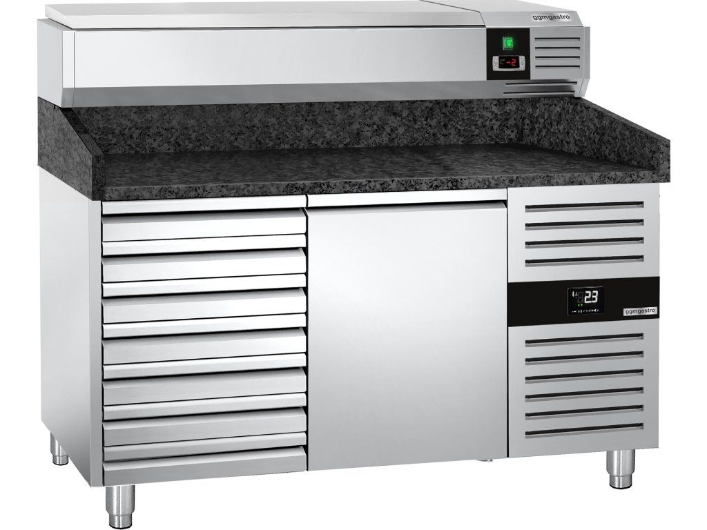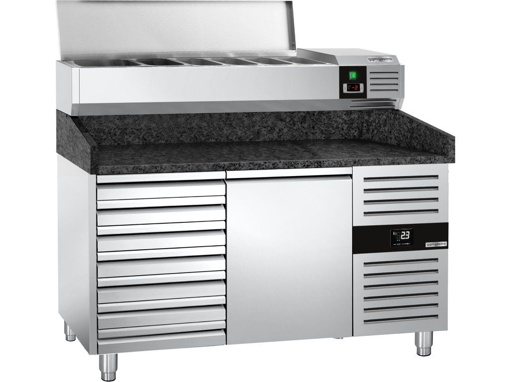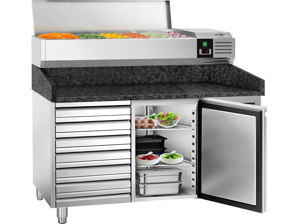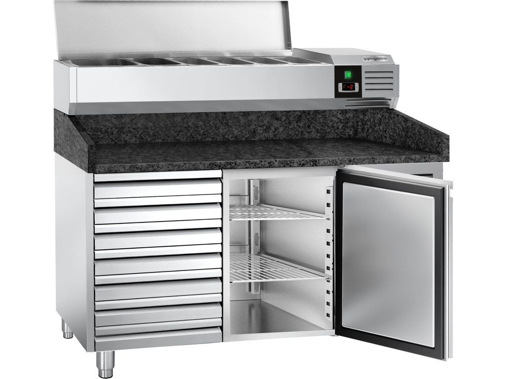 Stół chłodniczy do pizzy PREMIUM - 1500x800mm - z 1 drzwiami i 7 szufladami - włącznie z witryną chłodniczą nadstawną - 7x GN 1/4