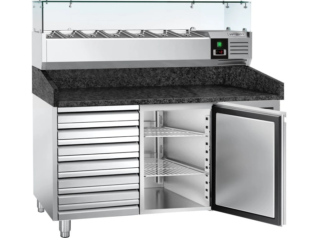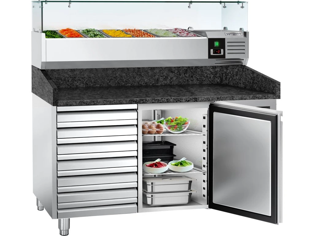 Stół chłodniczy do pizzy PREMIUM - 1500x800mm - z 1 drzwiami i 7 szufladami - z witryną chłodniczą nadstawną - 6x GN 1/3
