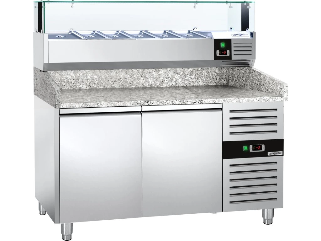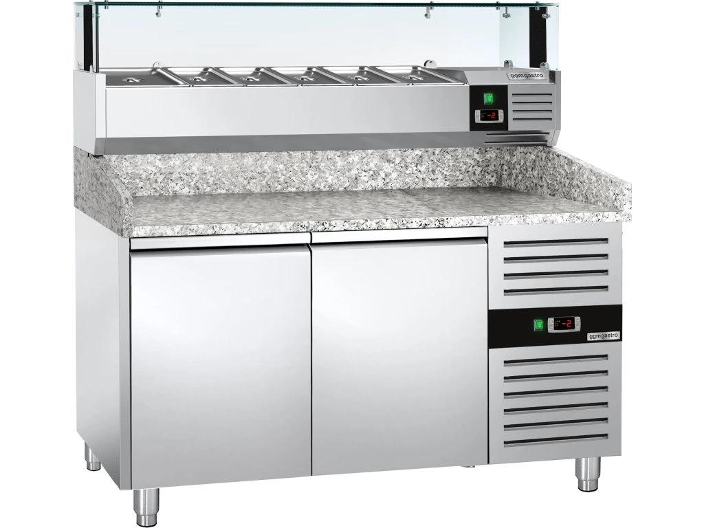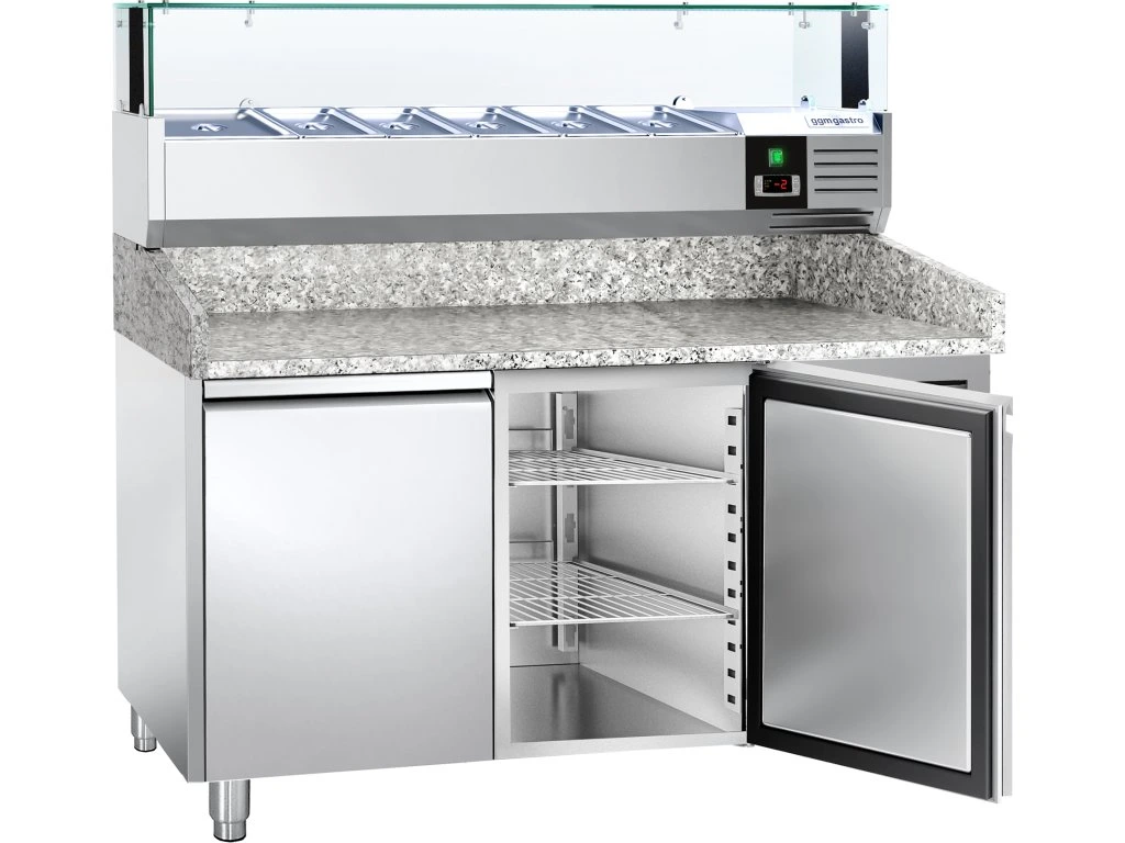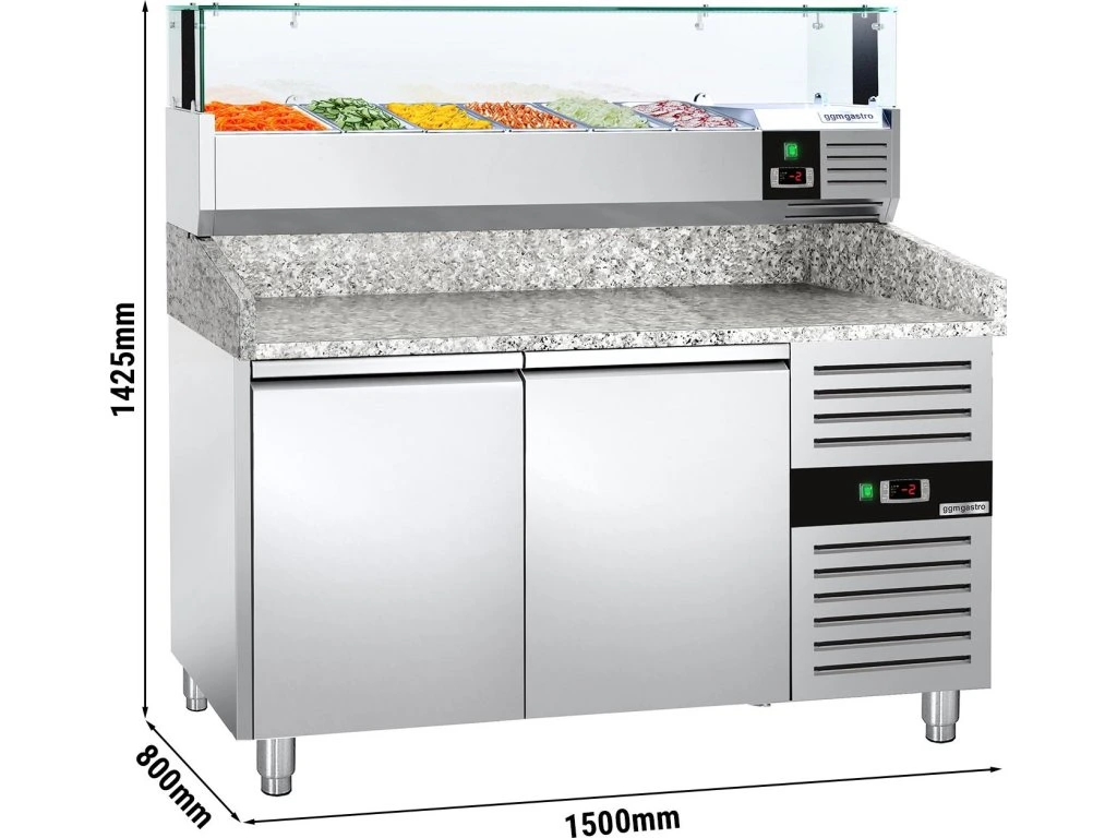 Stół chłodniczy do pizzy PREMIUM - 1500x800mm - z 2 drzwiami - włącznie z witryną chłodniczą nadstawną LED - 5x GN 1/3 + 1x GN 1/2