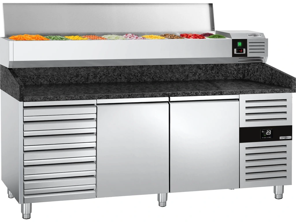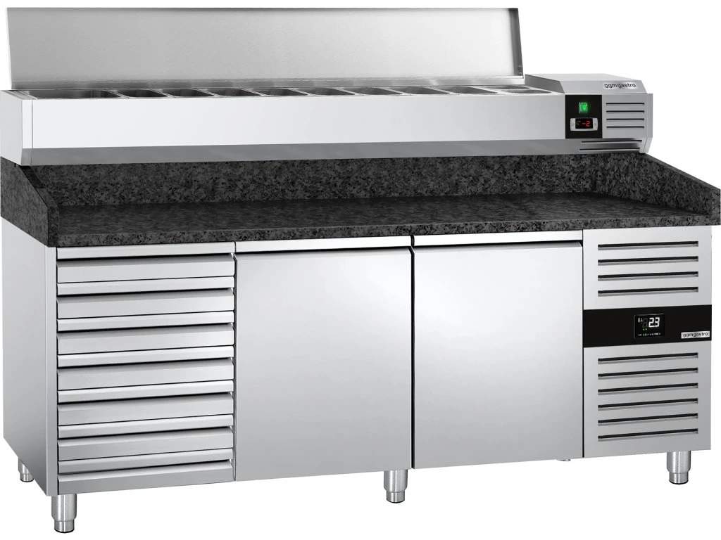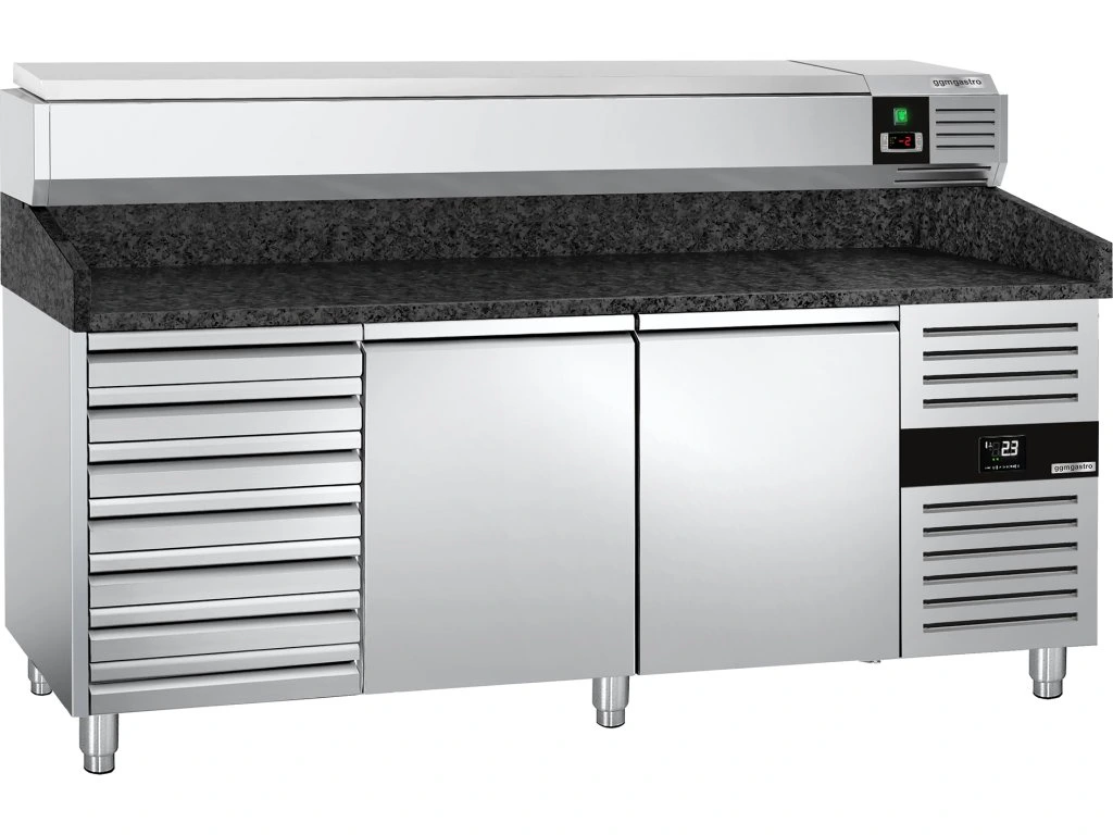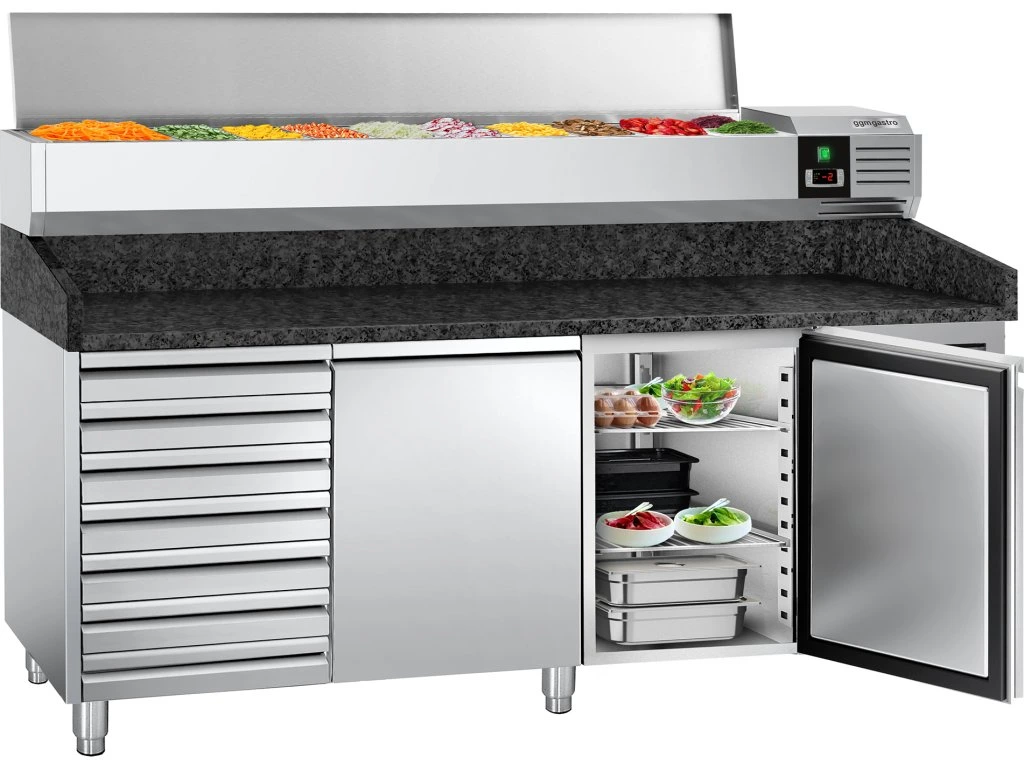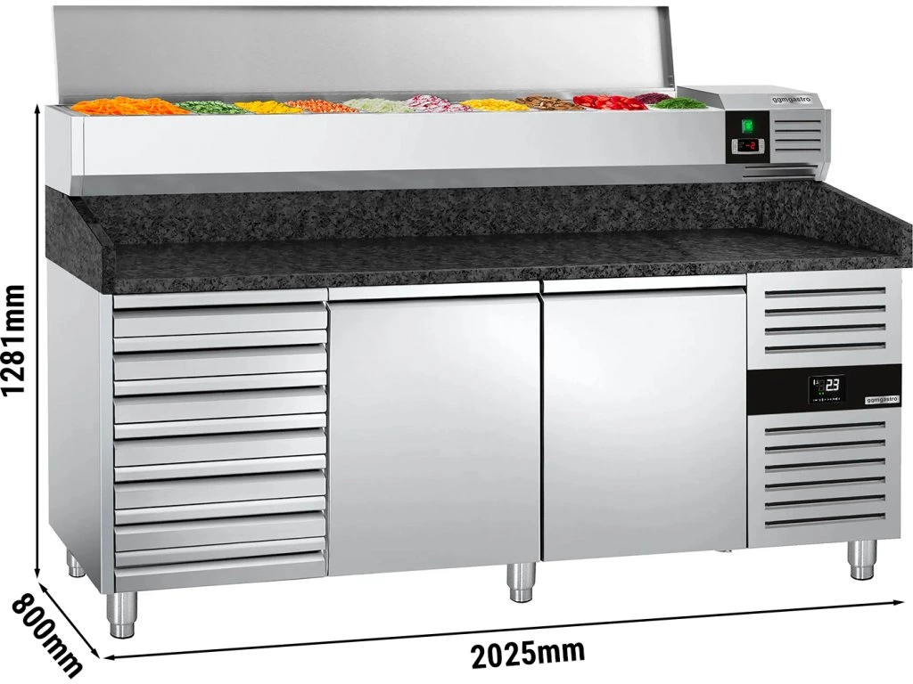 Stół chłodniczy do pizzy PREMIUM - 2000x800mm - z 2 drzwiami i 7 szufladami - włącznie z witryną chłodniczą nadstawną - 10x GN 1/4