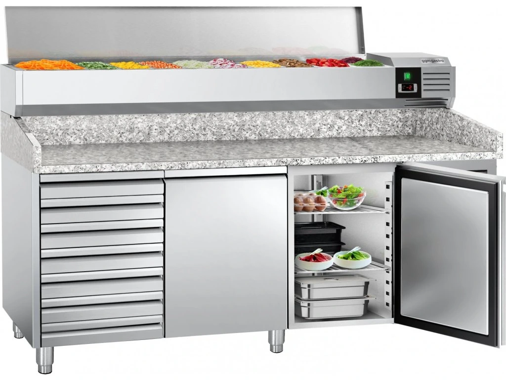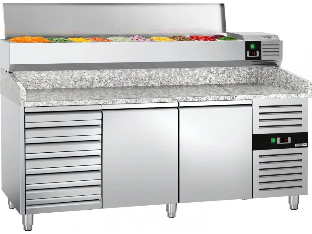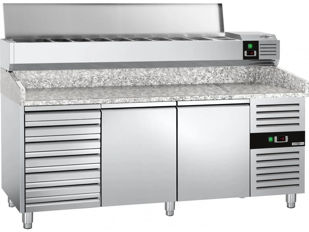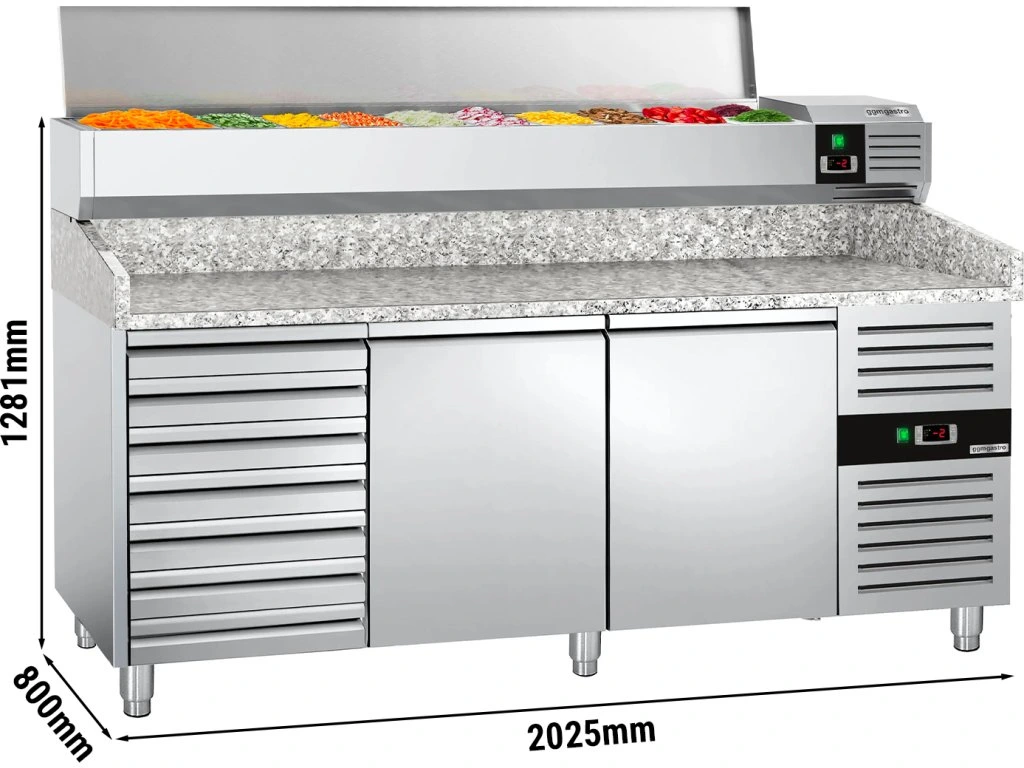 Stół chłodniczy do pizzy PREMIUM - 2000x800mm - z 2 drzwiami i 7 szufladami - włącznie z witryną chłodniczą nadstawną - 10x GN 1/4