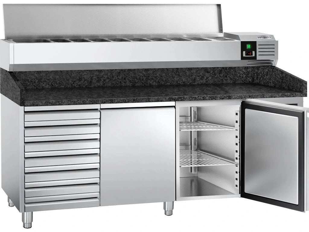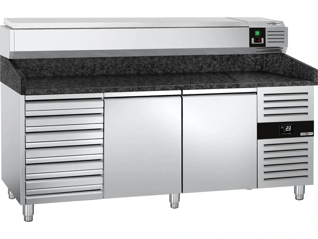 Stół chłodniczy do pizzy PREMIUM - 2000x800mm - z 2 drzwiami i 7 szufladami - włącznie z witryną chłodniczą nadstawną - 9x GN 1/3