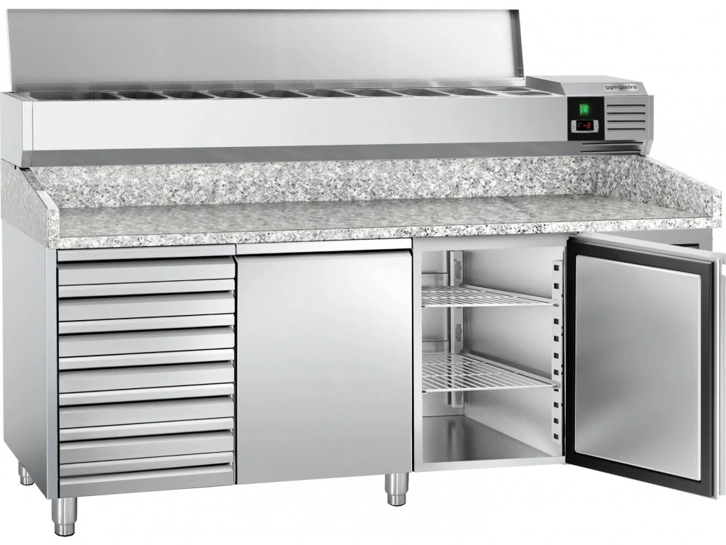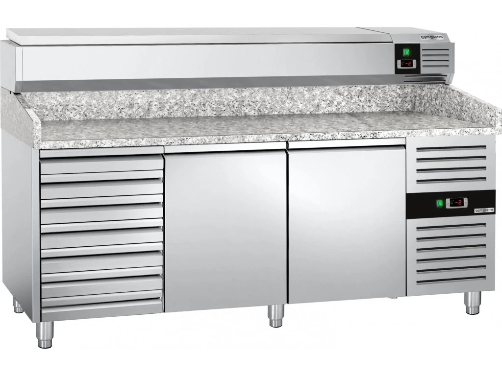 Stół chłodniczy do pizzy PREMIUM - 2000x800mm - z 2 drzwiami i 7 szufladami - włącznie z witryną chłodniczą nadstawną - 9x GN 1/3