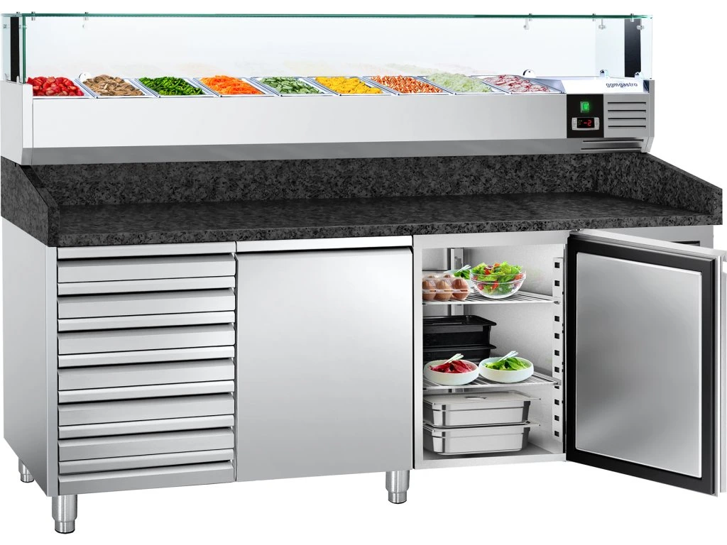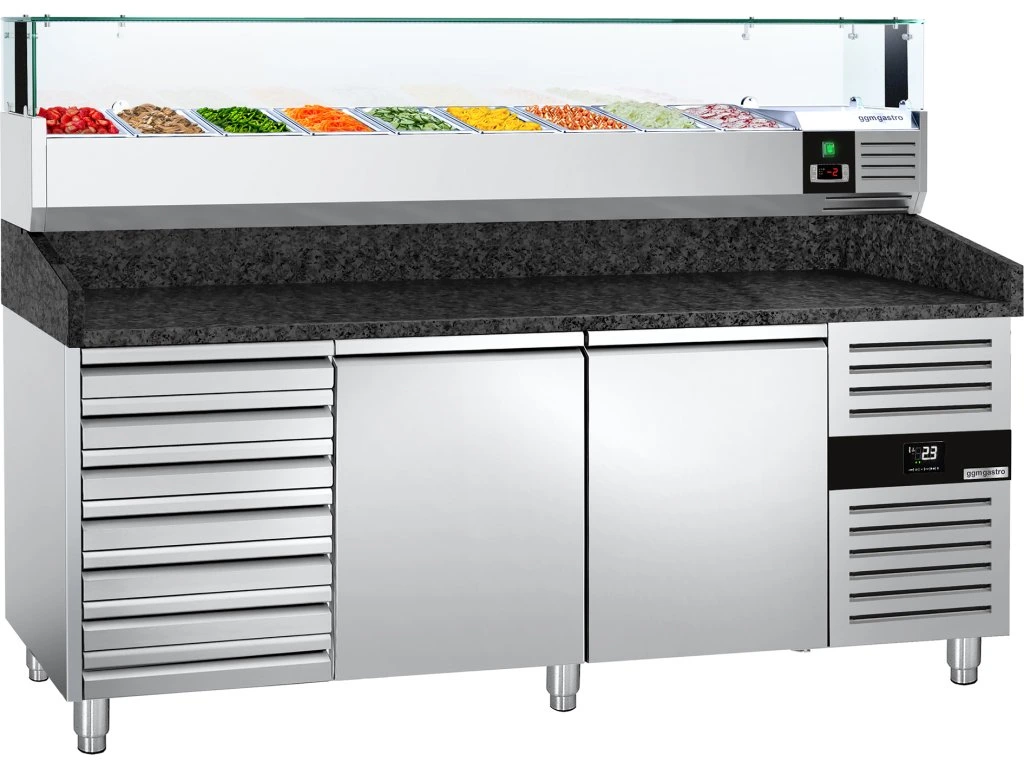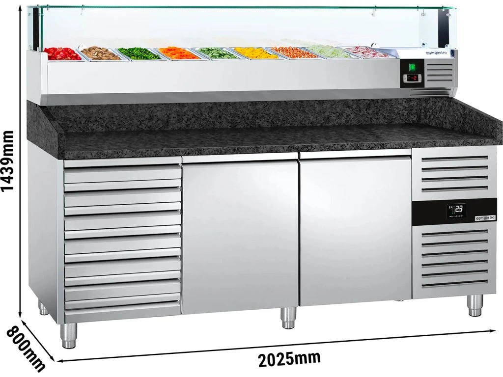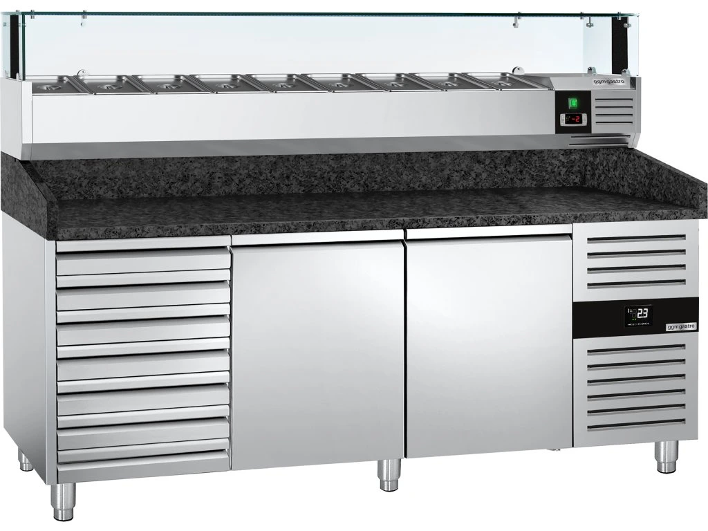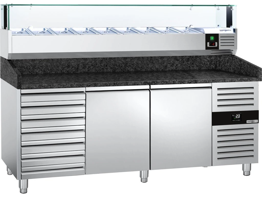 Stół chłodniczy do pizzy PREMIUM - 2000x800mm - z 2 drzwiami i 7 szufladami - włącznie z witryną chłodniczą nadstawną LED - 9x GN 1/3