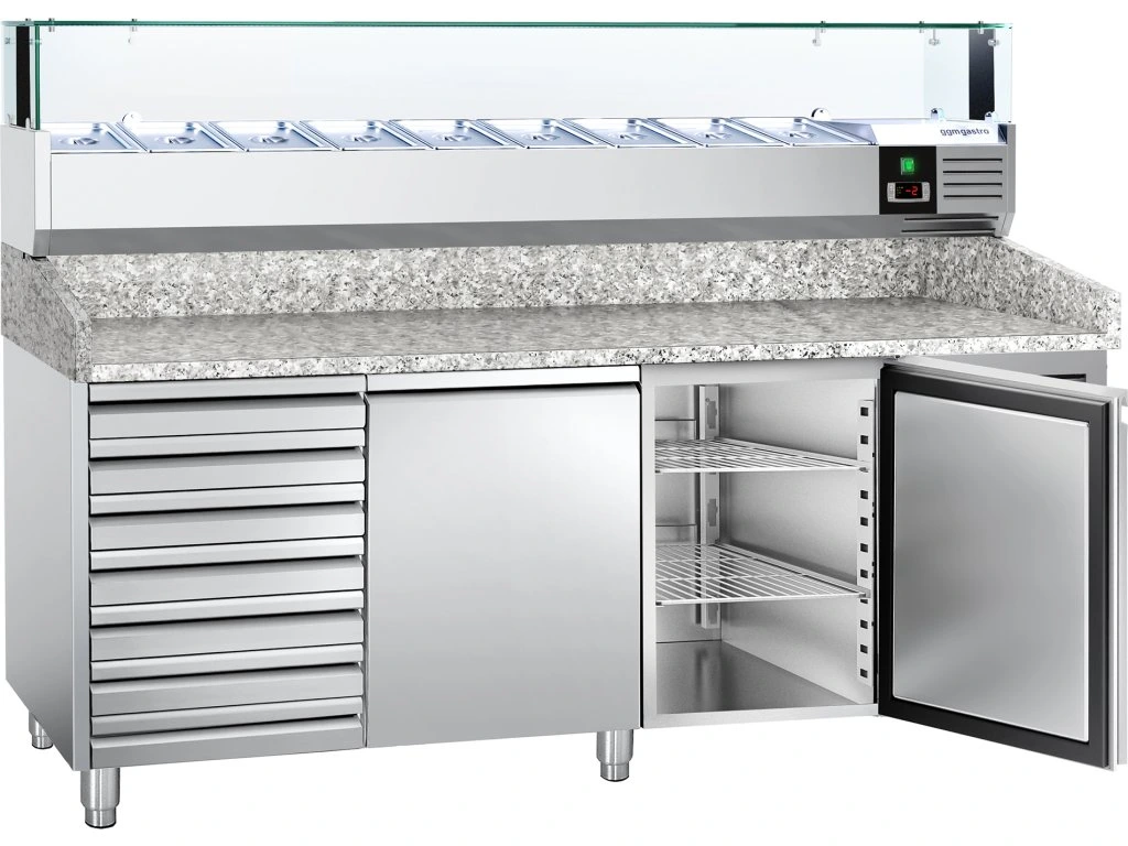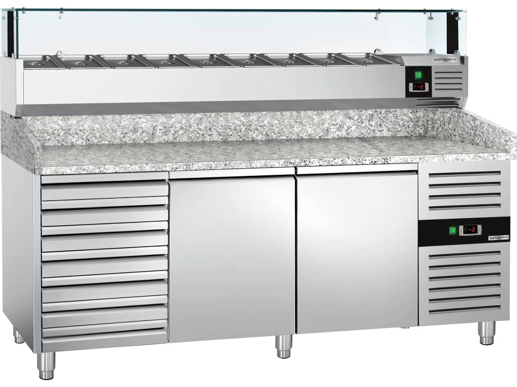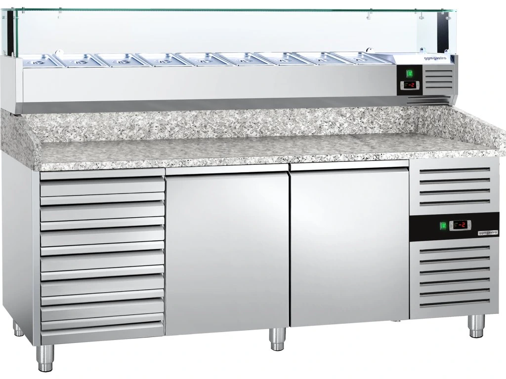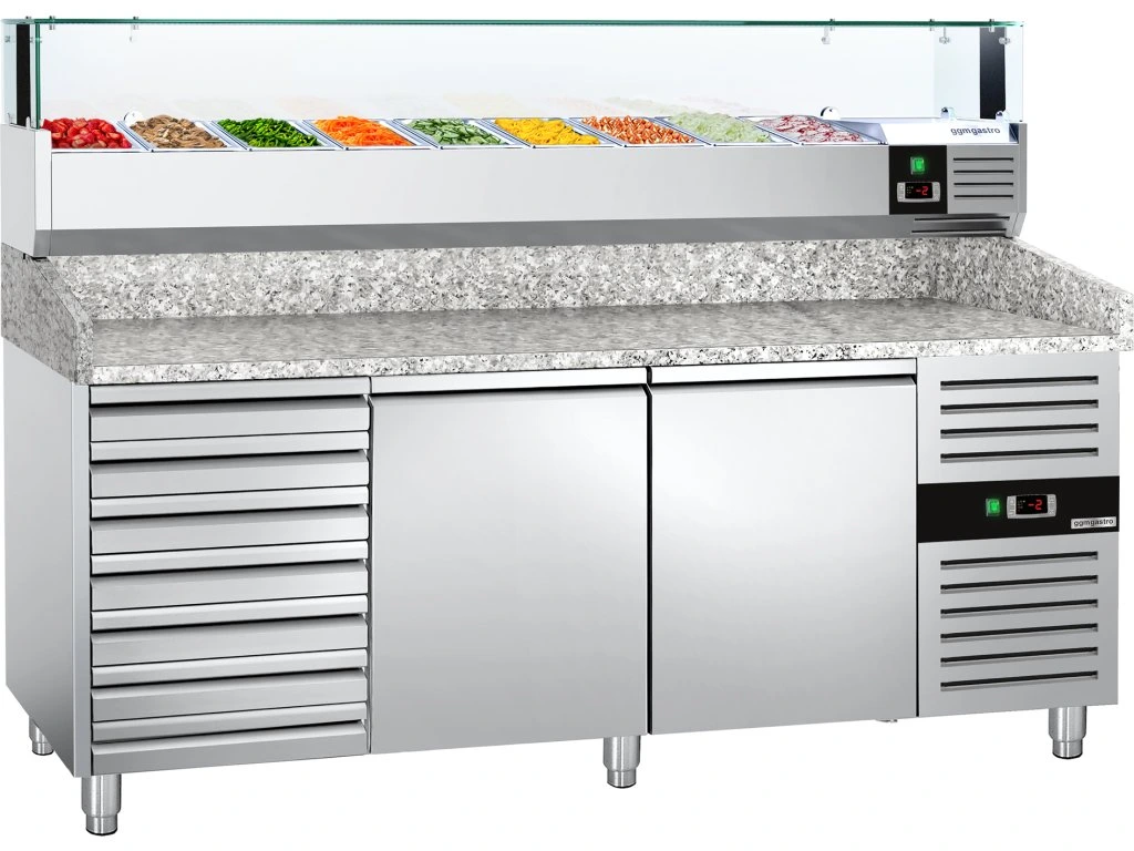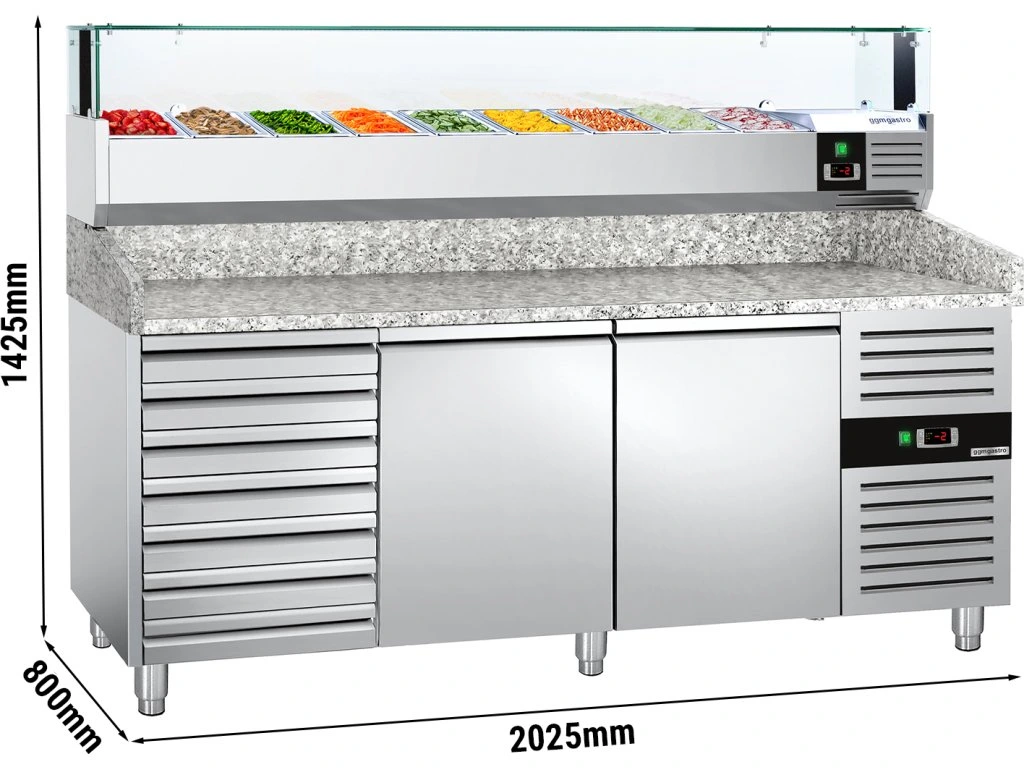 Stół chłodniczy do pizzy PREMIUM - 2000x800mm - z 2 drzwiami i 7 szufladami - włącznie z witryną chłodniczą nadstawną LED - 9x GN 1/3